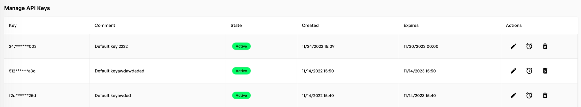 特定のサービスへのアクセスを許可または制限するために、APIではキーベースの認証アプローチを使用しています。APIキーを管理ページでは、新しいキーの作成、権利と有効期限の設定、IPアクセスの制限を行うことができます。