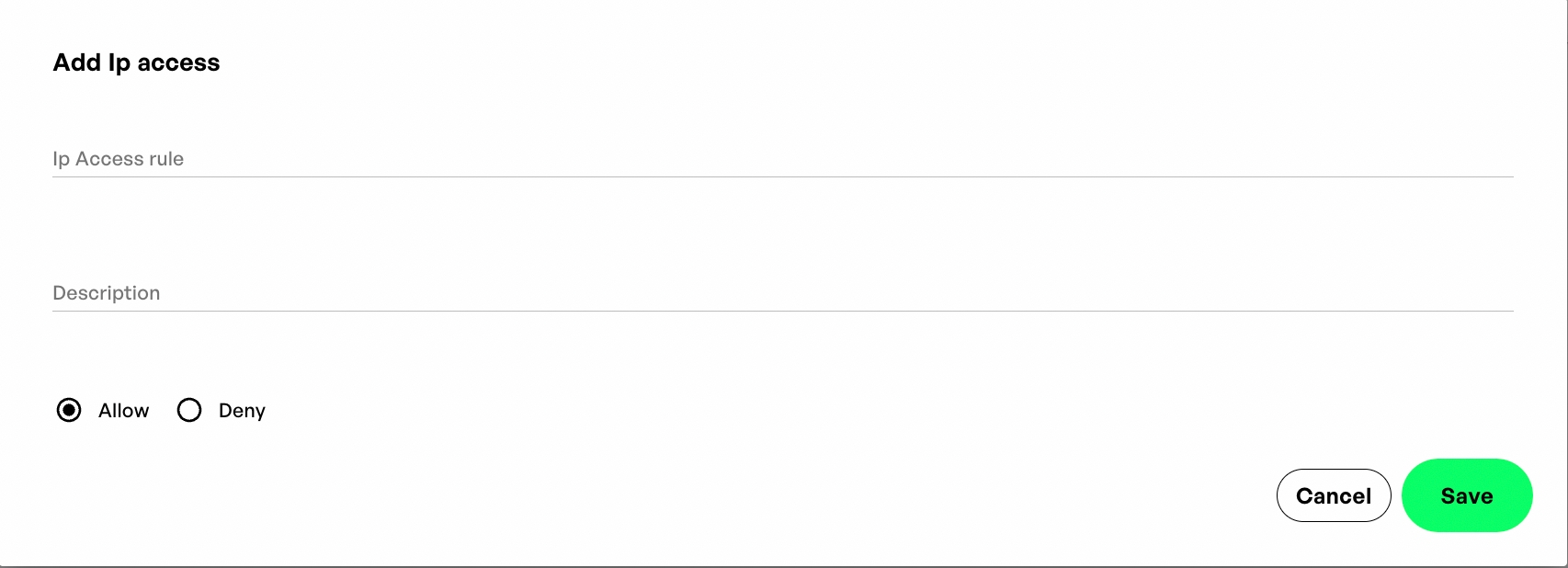 上記に続き、アラーム時計のアイコンを選択すると、IPアドレスに基づいてAPIキーを使用できるユーザーをさらにロックダウンすることができます。このメニューでは、Allow/Deny Rulesの組み合わせで管理できます。
