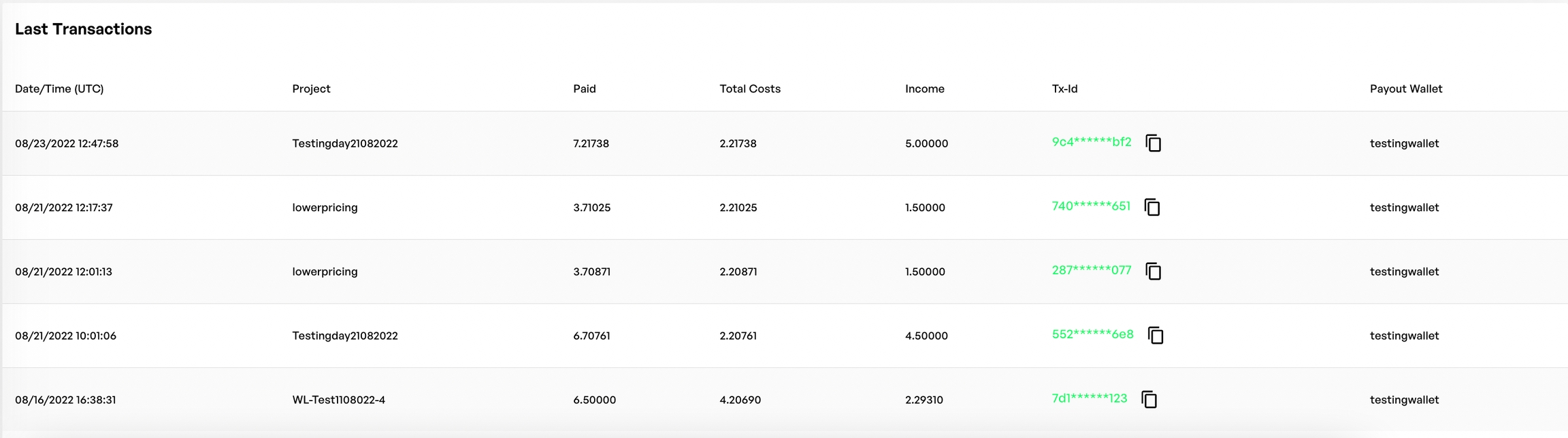 ダッシュボードの3つ目のセクションは、直近の取引に関する簡単な概要です。