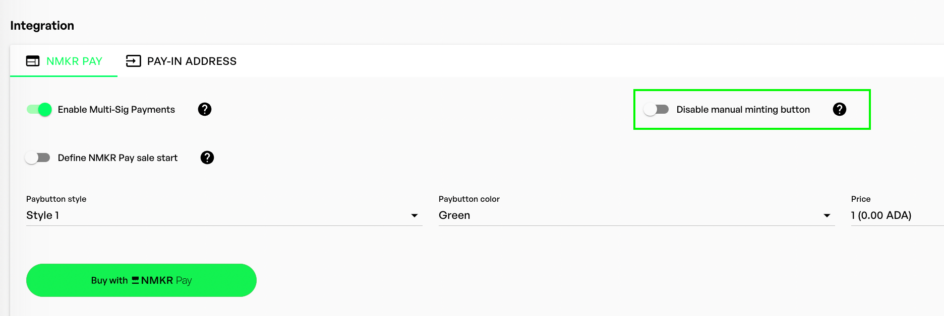 NMKR Payは、[フィアット支払いと](https://docs.nmkr.io/nmkr-studio/set-up-sales/nmkr-pay/fiat-payment)ウォレットをつなぐオプションの他に、Pay-In Addressで知られているような従来の「アドレスにADAを送る」ミントも提供します。Pay-In Addressとは違って、マニュアルミントは[NMKR Payインターフェイスのメリットと](https://docs.nmkr.io/nmkr-studio/set-up-sales/nmkr-pay#nmkr-pay-vs.-pay-in-address)ボット保護のキャプチャを利用できます。