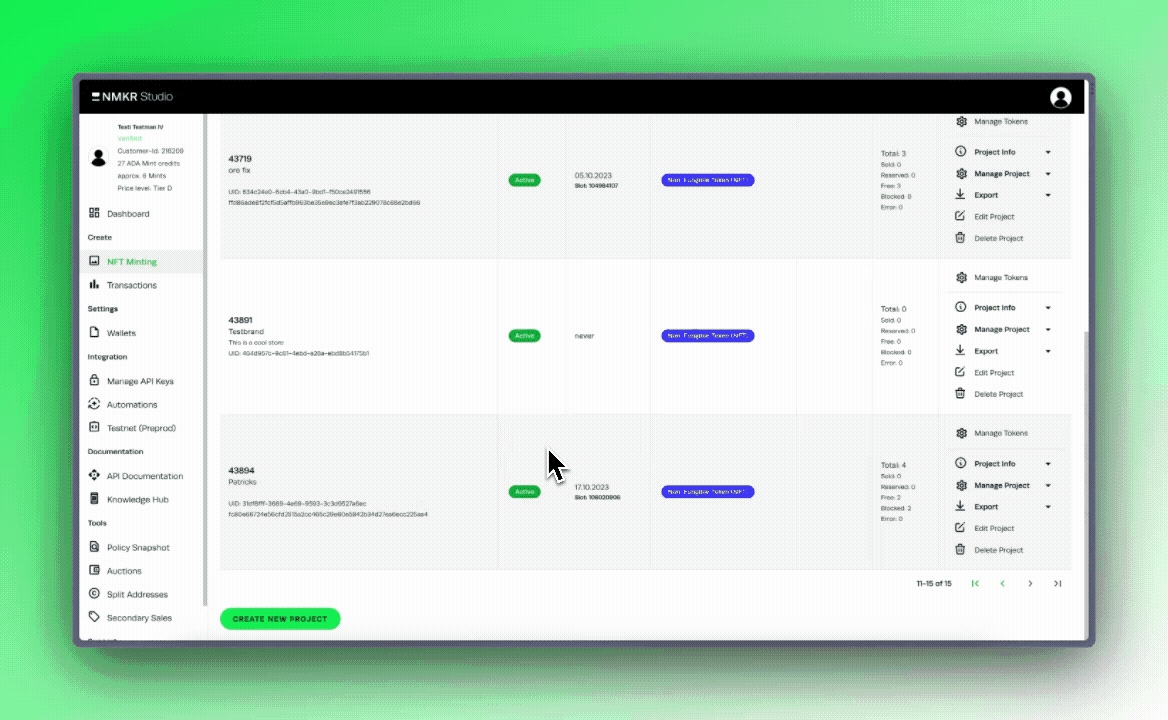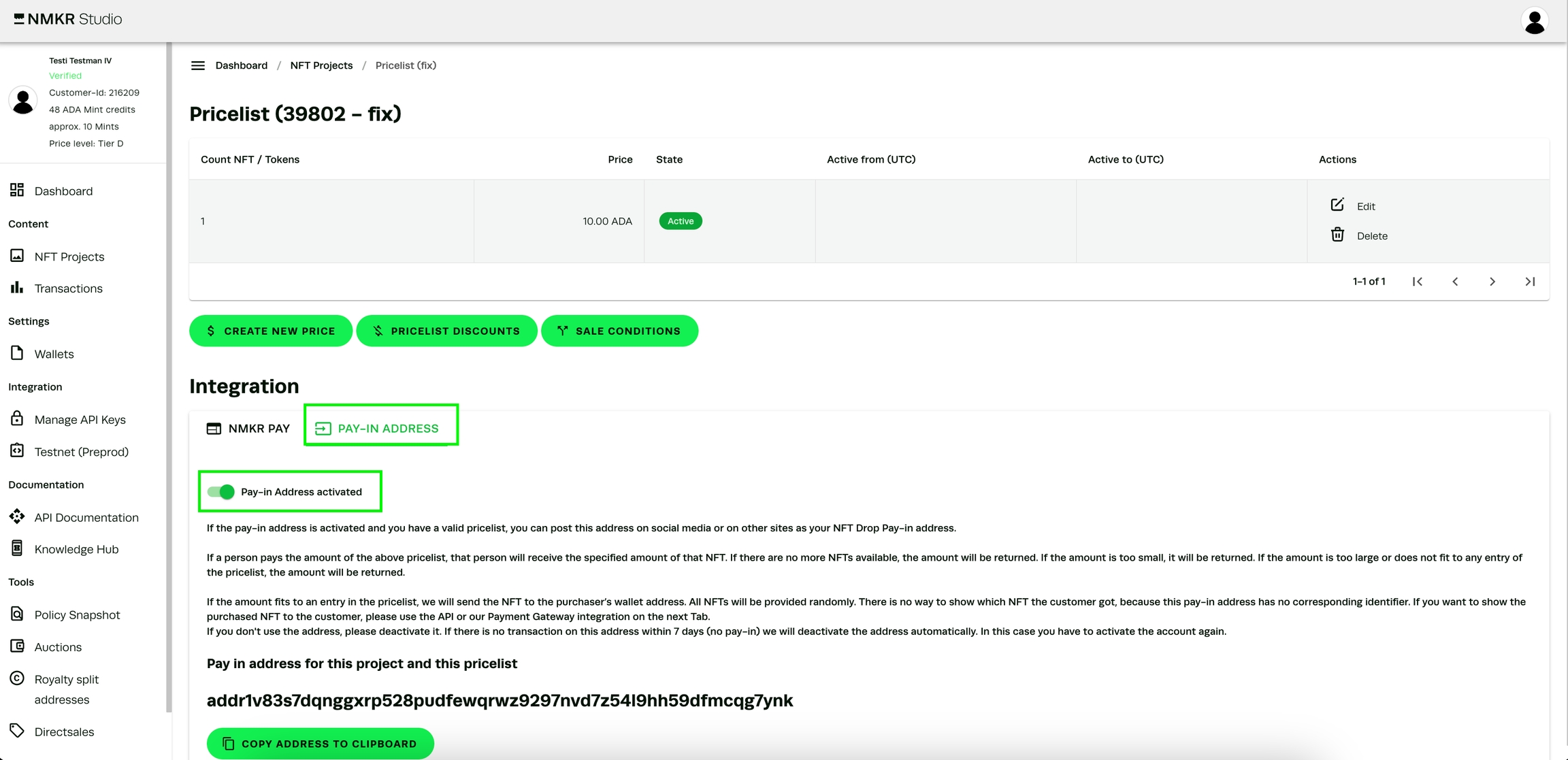 Pay-In 統合は2番目のタブにあり、NMKR Pay統合もここにあります。