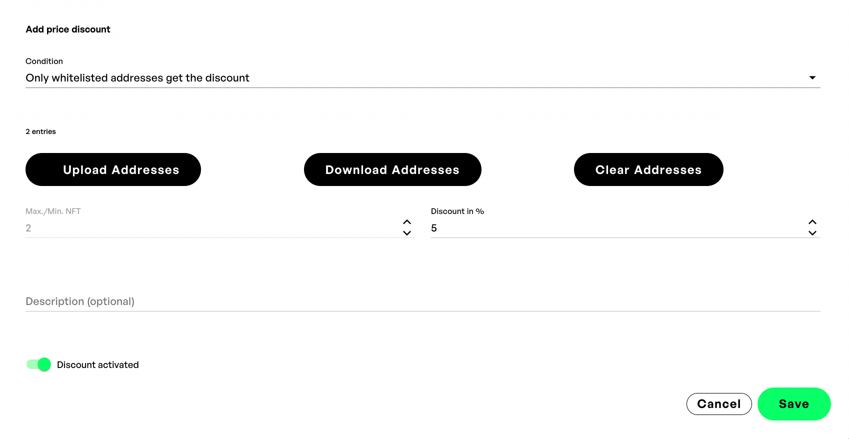 この割引機能は、ホワイトリストに登録されたウォレットアドレスにのみ割引を付与します。