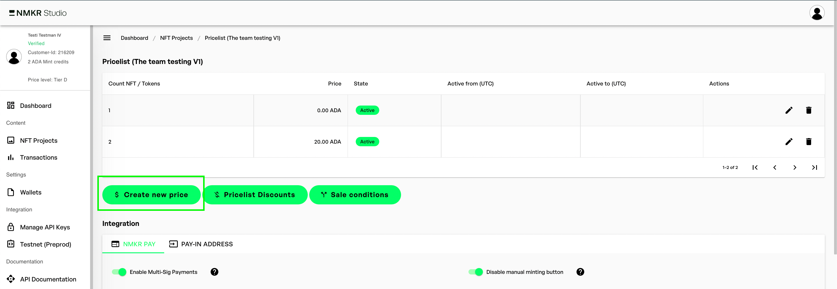 技術的な理由から、最低価格は6.5ADAとなっています。[マルチシグ決済](https://docs.nmkr.io/nmkr-studio/set-up-sales/nmkr-pay/multisig-payment)を利用することで、最低価格を3ADAまで下げることができます。これはまだユーザー インターフェースに実装されていないため、[チケットを作成](https://nmkr.io/support)して設定してください。