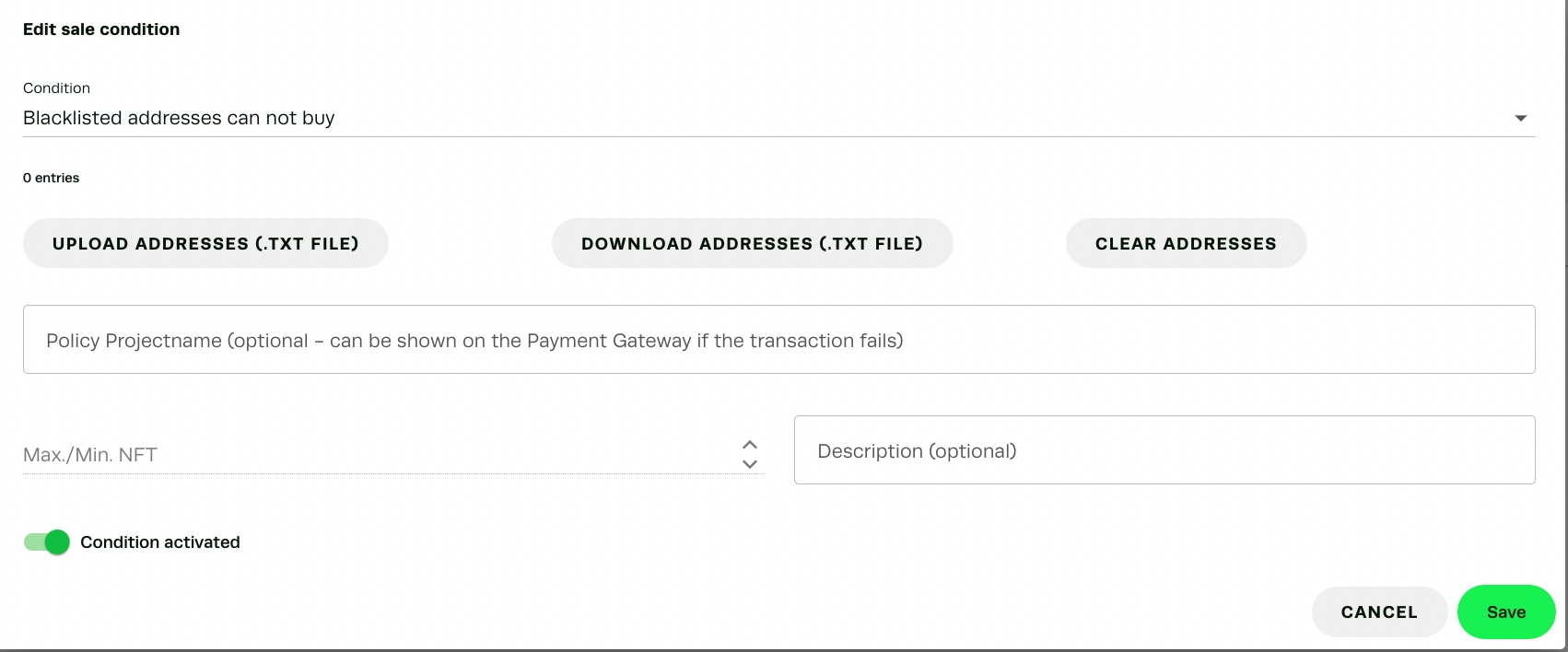 この販売条件では、販売への参加をブロックしたいアドレスを含む簡単なテキストファイルをアップロードすることができます。