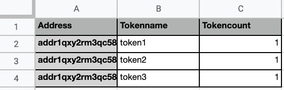 トークン名を新しいcsvファイルに追加するか、ダウンロードした csvファイルを以下のように再構築し、受け取りアドレス(ステークアドレスではありません)やトークンの量(代替可能トークンを使用するプロジェクトにのみ関連し、プロジェクトにNFTがある場合はTokencount "1 "を使用してください)などの詳細を追加します。