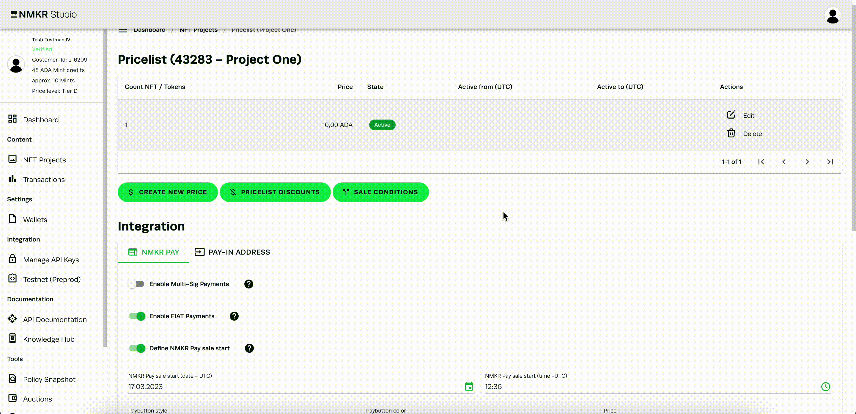 オンデマンド販売を有効にするには、プロジェクトの[価格](https://docs.nmkr.io/nmkr-studio/set-up-sales/manage-prices-pricelist#open-the-price-list)リストに移動し、[各価格/金額のペアの編集ボタンを](https://docs.nmkr.io/nmkr-studio/set-up-sales/manage-prices-pricelist/create-new-prices)クリックして価格を有効にします。