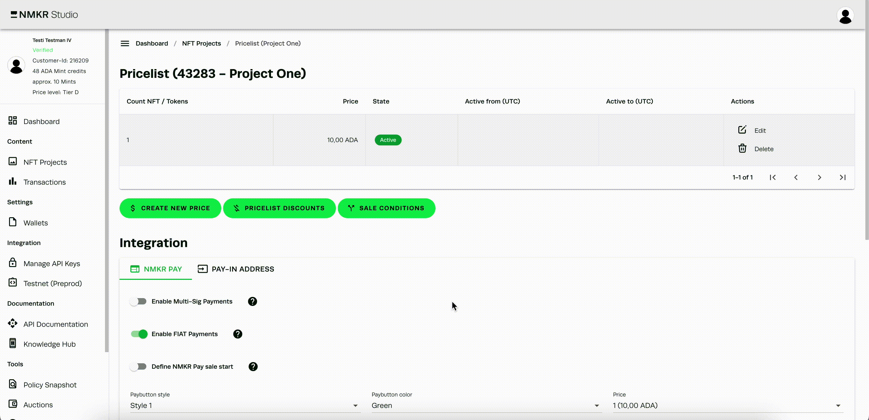価額リストタブを下にスクロールし、[Pay-In Address統合タブに](https://docs.nmkr.io/nmkr-studio/set-up-sales/pay-in-address#enable-the-pay-in-address)切り替えます。