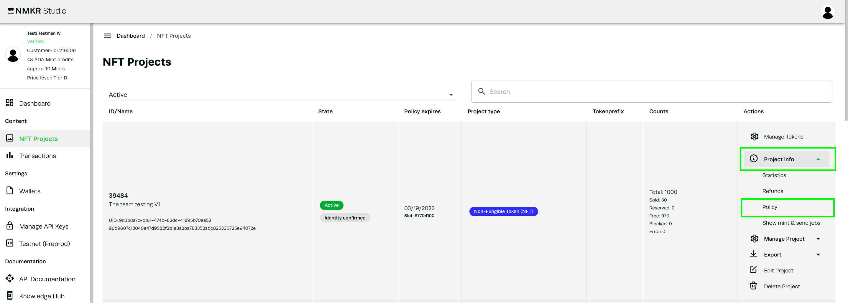 ポリシーIDを表示するには、[プロジェクトを管理タブの](https://docs.nmkr.io/nmkr-studio/project)右側にあるアクションバーのポリシーボタンをクリックします。