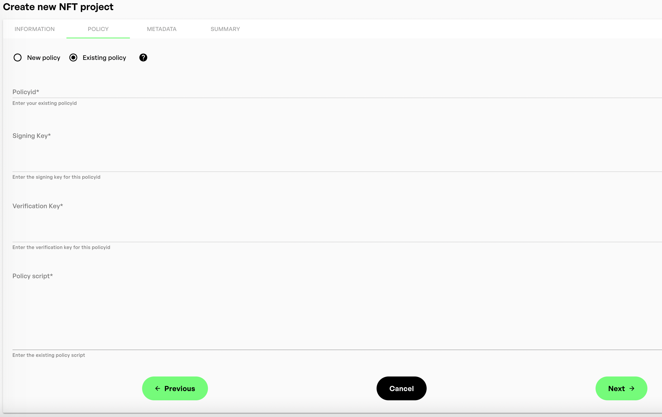 ポリシー・キーをインポートするには、[新しいプロジェクトを作成](https://docs.nmkr.io/nmkr-studio/project/create)し、1ページ目にプロジェクトの詳細を記入し、2ページ目のタブに進んでください。