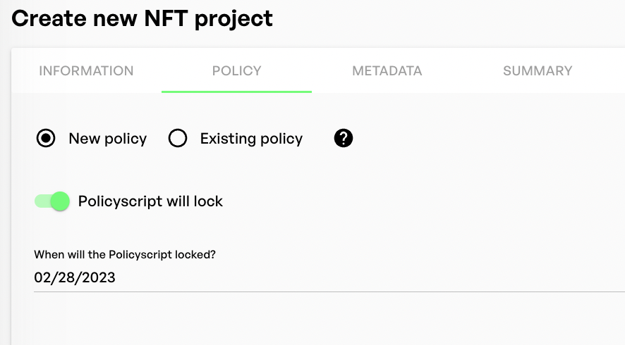 新しいポリシーは、[プロジェクトを設定](https://docs.nmkr.io/nmkr-studio/project/create)するときに作成することができます。