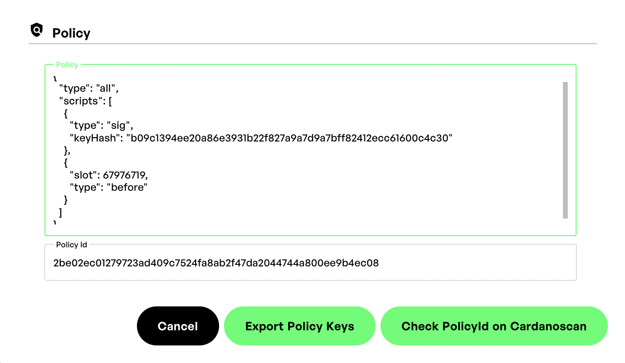 [https://cardanoscan.io](https://cardanoscan.io/)でポリシーIDを確認したり、ポリシーキーをエクスポートして別のプロジェクトで使用したりできるようになりました。