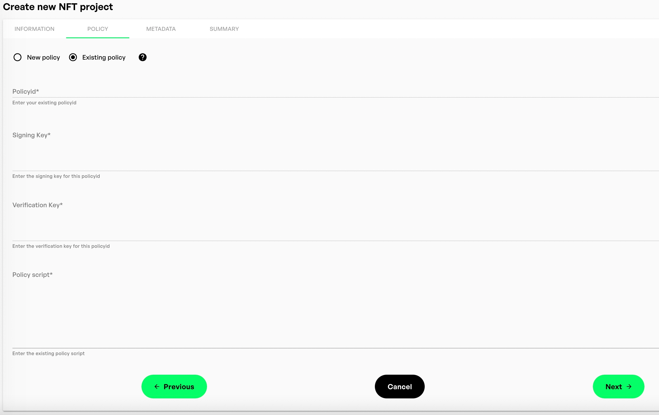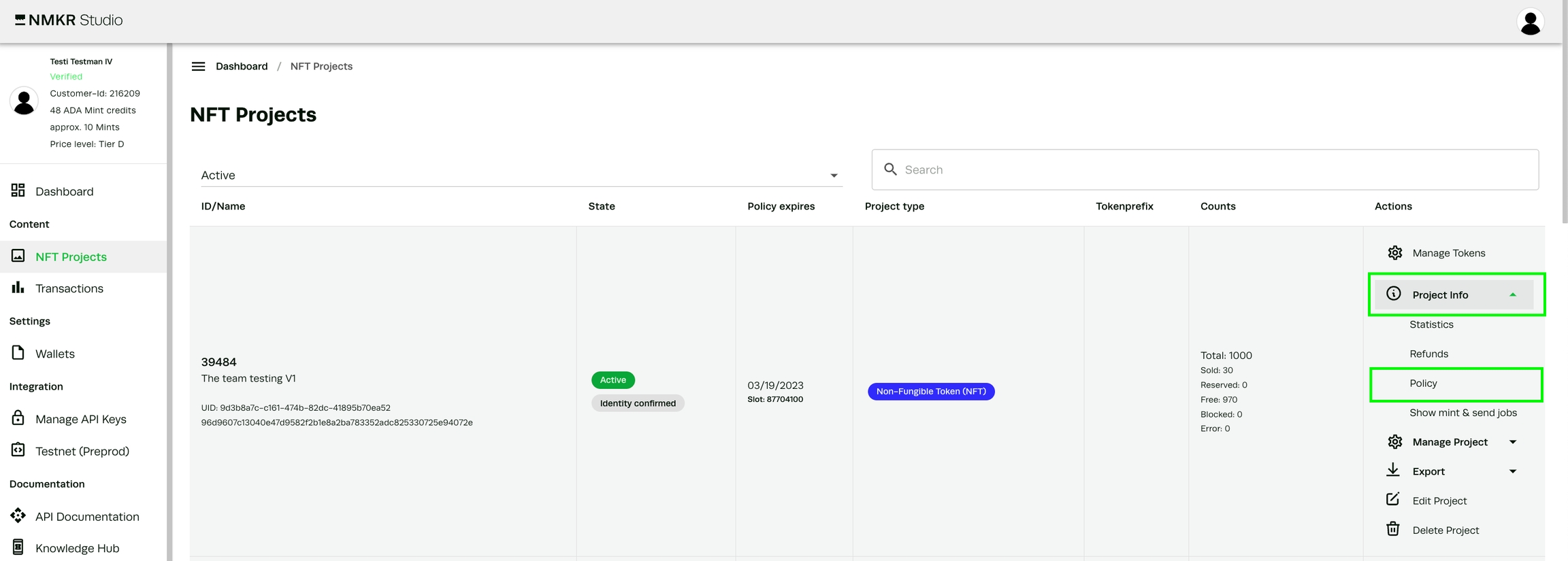 NMKR Studioでは、ポリシーを完全にコントロールすることができます。つまり、好きなようにエクスポートして使用することが可能で、キーをエクスポートして新しいプロジェクトにインポートすることで、同じポリシーIDで複数のプロジェクトを作成することもできます。これは、1つのプロジェクトで販売できる量を分けたり、ホワイトリスト用に分けたりするために使用できます。