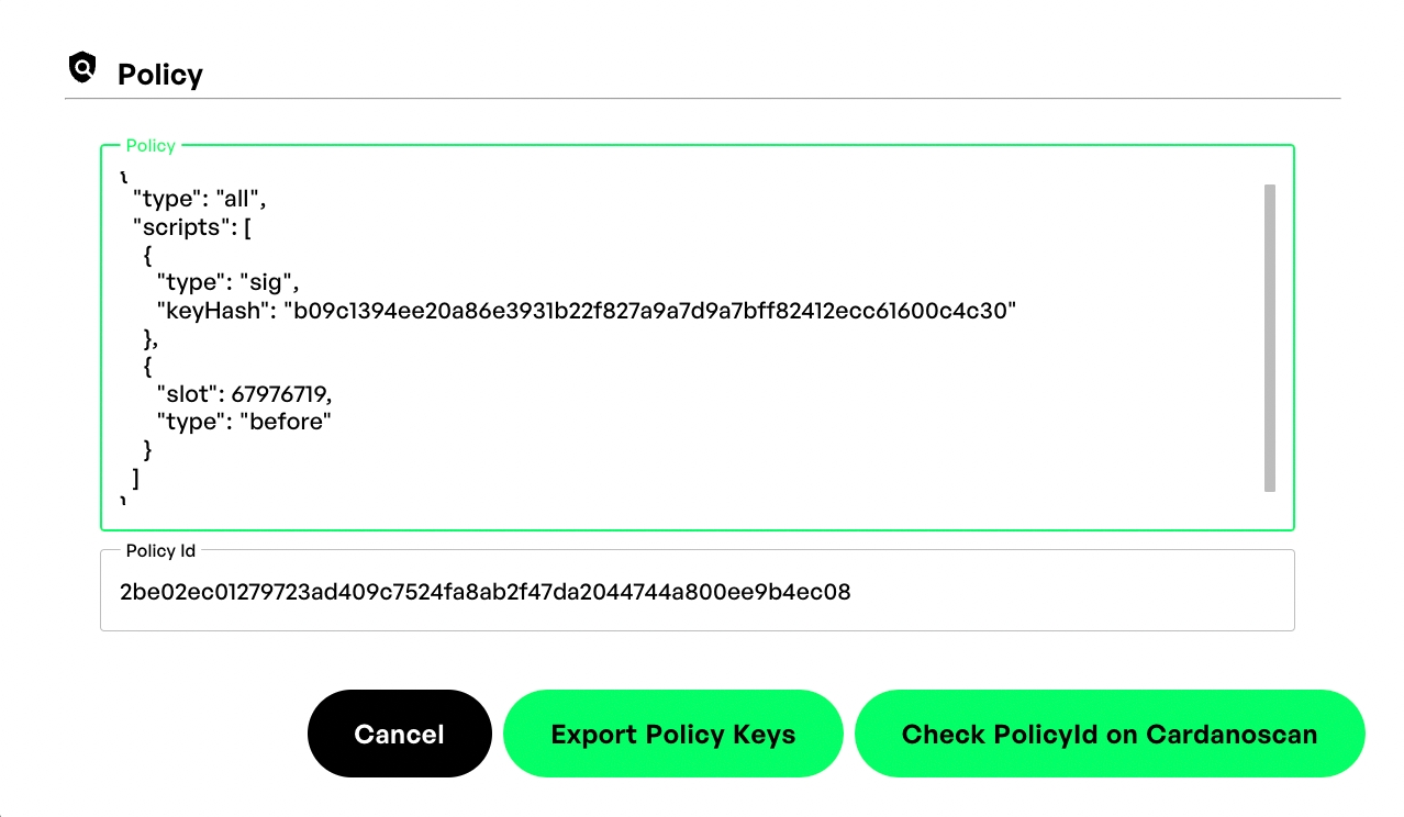 https://cardanoscan.ioでポリシーIDを確認したり、ポリシーキーをエクスポートして別のプロジェクトで使用したりできるようになりました。