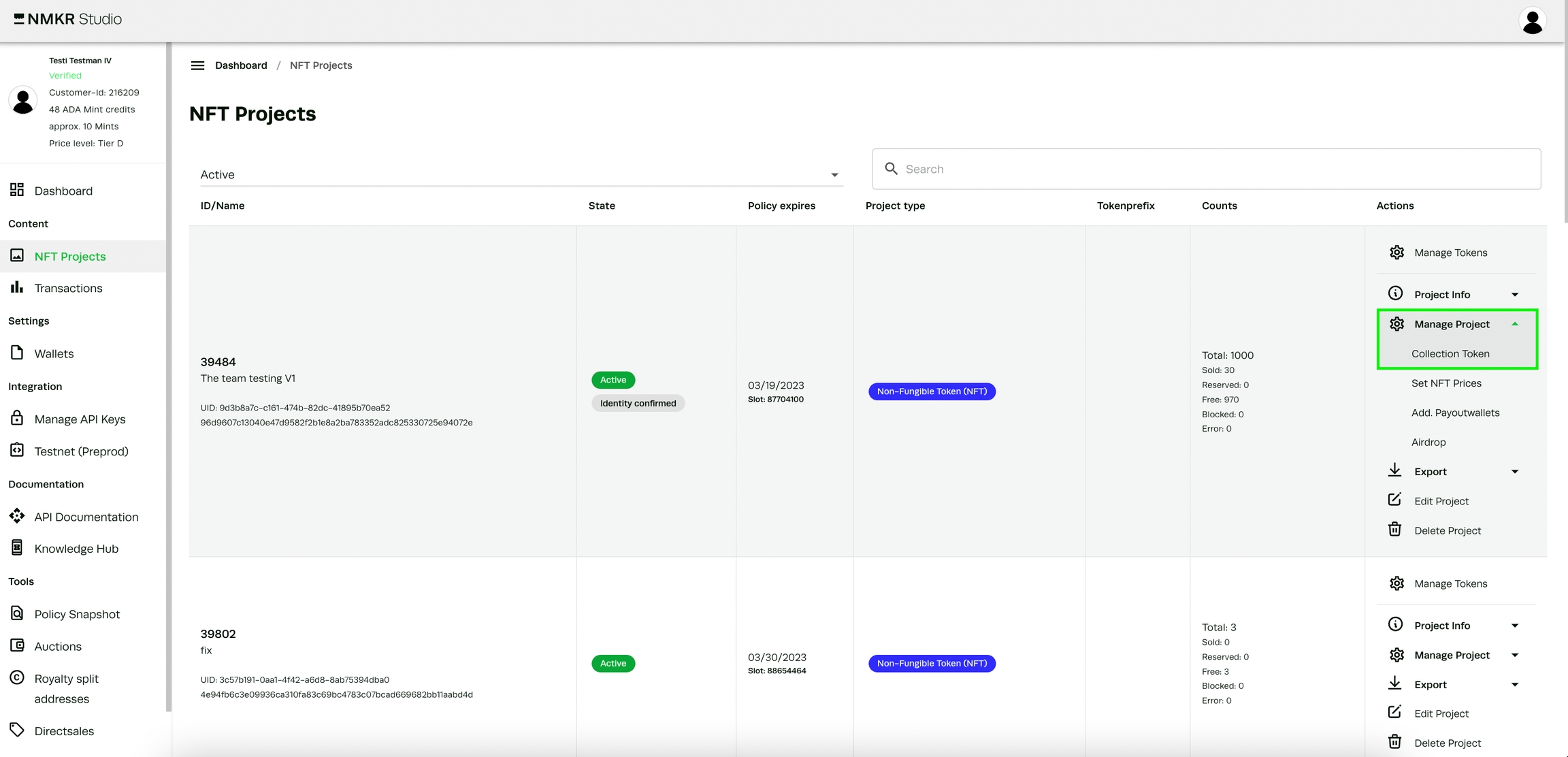 プロジェクトのアクションバーにある「Collection Token」ボタンからロイヤリティにアクセスしてください。