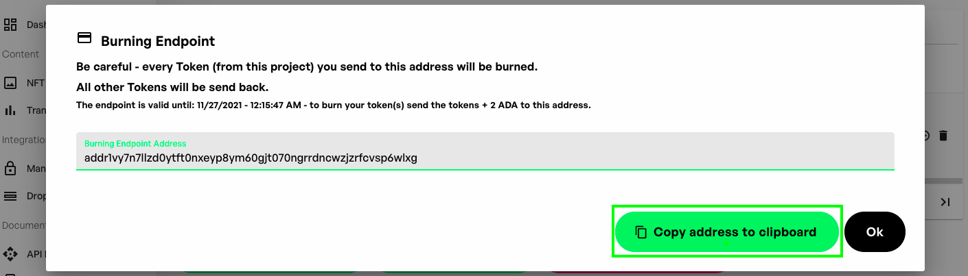 次のステップでハイライトされる対応するボタンをクリックしてアドレスをコピーし、「はい(Ok)」をクリックします。このアドレスは、トークンをバーンするために同じトランザクションで2 ADAと一緒にNFTを送信するアドレスです。