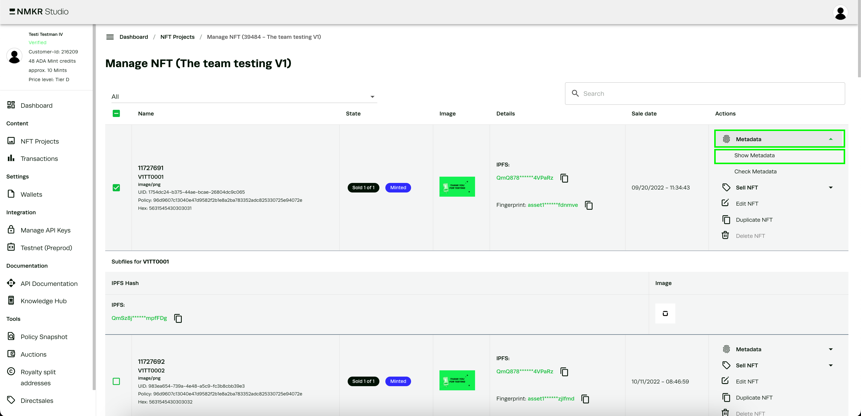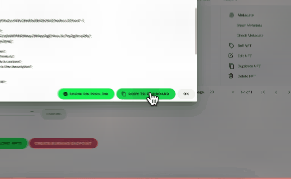 次のタブはトークンのメタデータを表示し、クリップボードにコピーするか、[pool.pmメタデータテストサイトで](https://pool.pm/test/metadata)表示することができます。pool.pmテストサイトで表示するには、NMKR Studioからメタデータをコピーし、ウェブサイトの左側にあるフィールドに貼り付けてください。