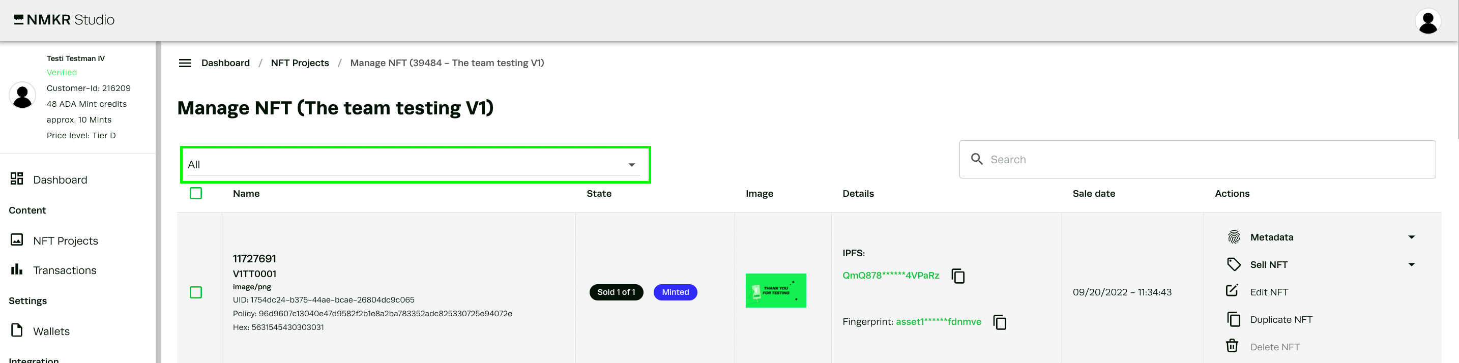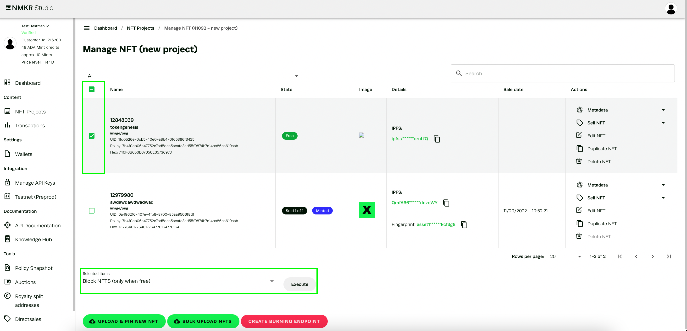 特定のNFTの売却をブロックするには、トークンにチェックを入れ、ドロップダウンで「NFTの売却をブロック」を選択し、実行を押してください。トークンはブロックされたものとして表示され、それによってフィルターすることもできます。