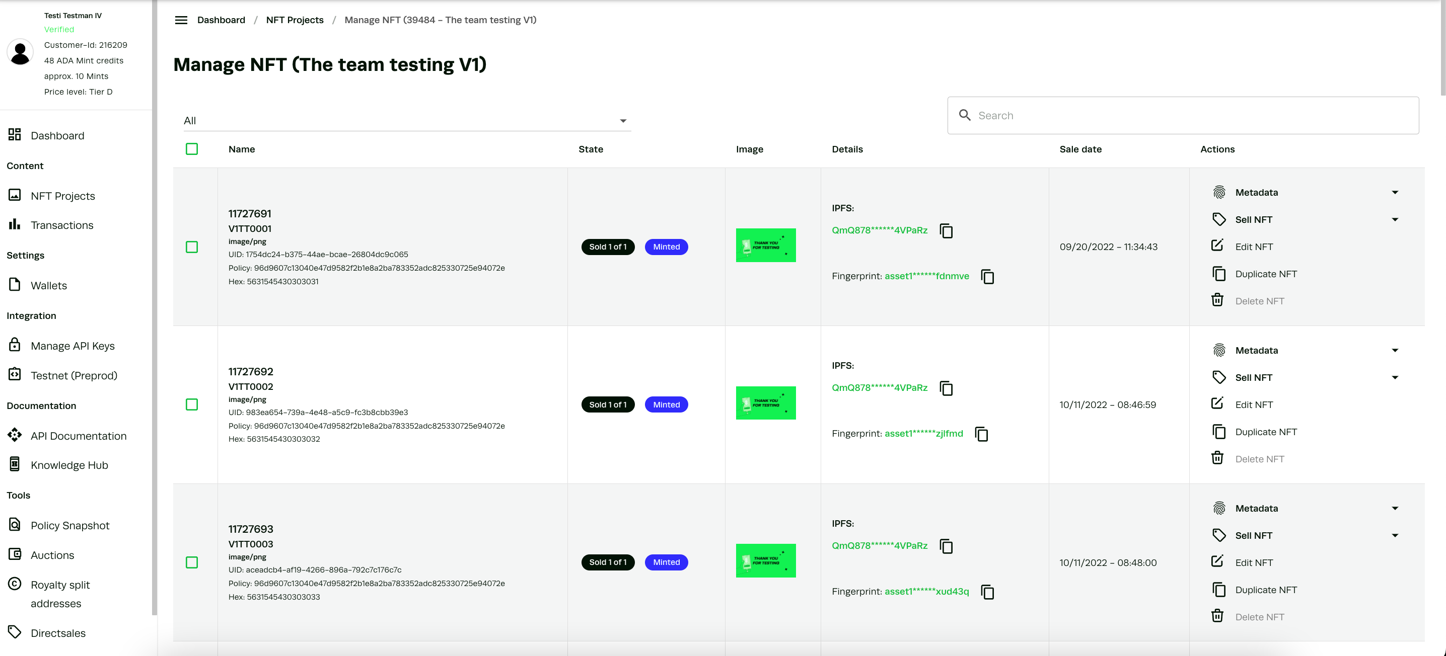 この列にはトークンID、資産名の下にトークンUID、トークンのポリシーが表示されます。