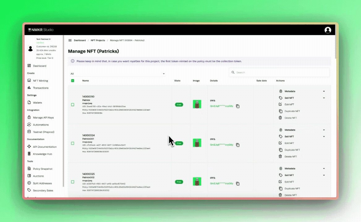 単一のトークンまたは少量のトークンを削除するには、NMKR Studio ユーザーインターフェースで手動で削除するのが理にかなっています。アクションバーにそのためのボタンがあります。