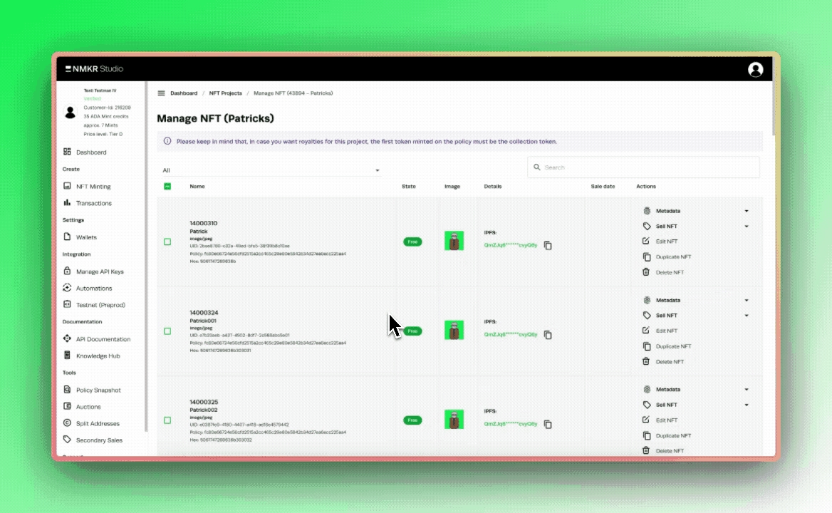 NMKR Studioで単一のトークンを削除する