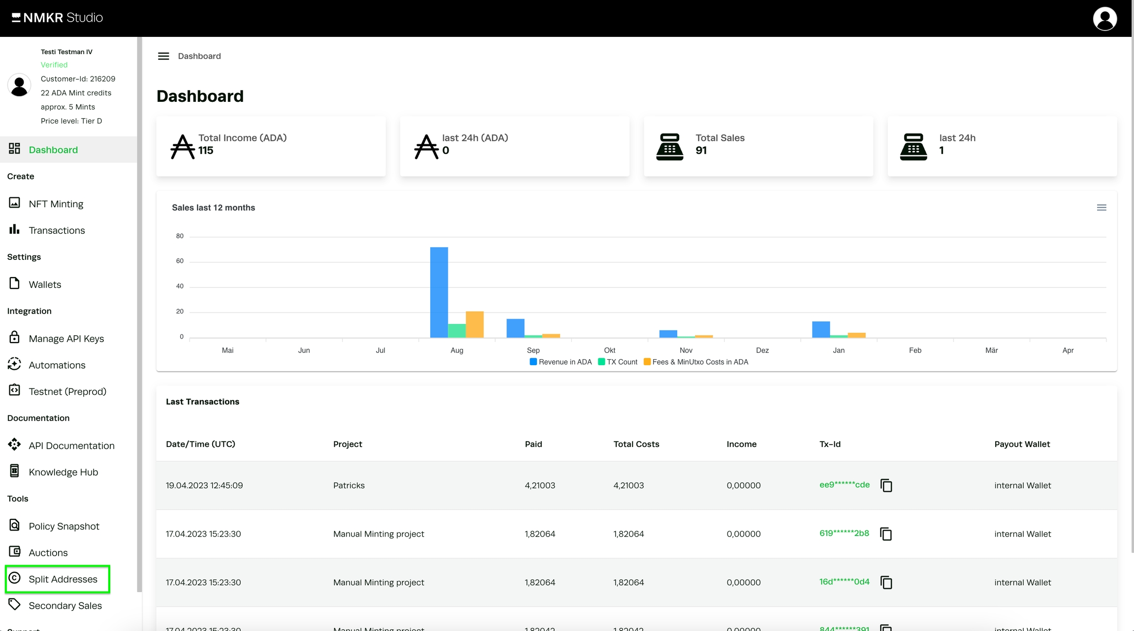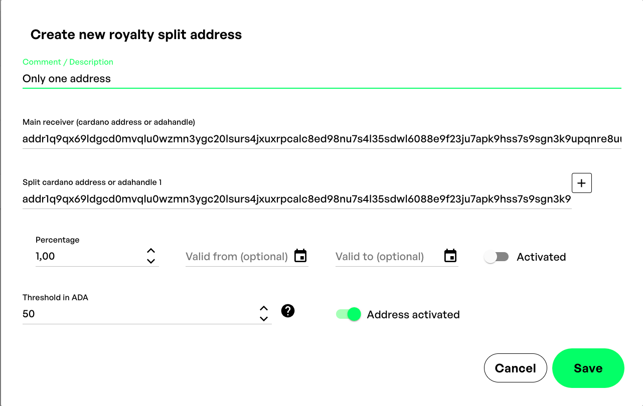 分割アドレスでは、ロイヤリティを受け取るアドレスを指定し、複数の受信者ウォレットに異なる割合で分配することができます。また、受信アドレスをいつでも変更できるという大きなメリットもあります。また、プロジェクトのオーナーが変わった場合に便利な、adahandleを受信者アドレスとして使用することもできます。
