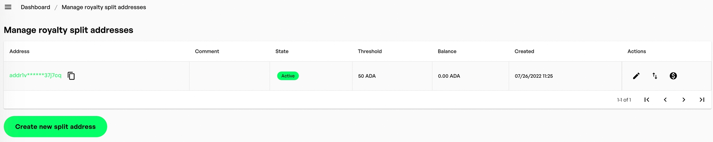 分割アドレスは、後にロイヤリティトークンのミントで指定されるロイヤリティの正確な割合とは関係なく、入ってくる資金を分配します。