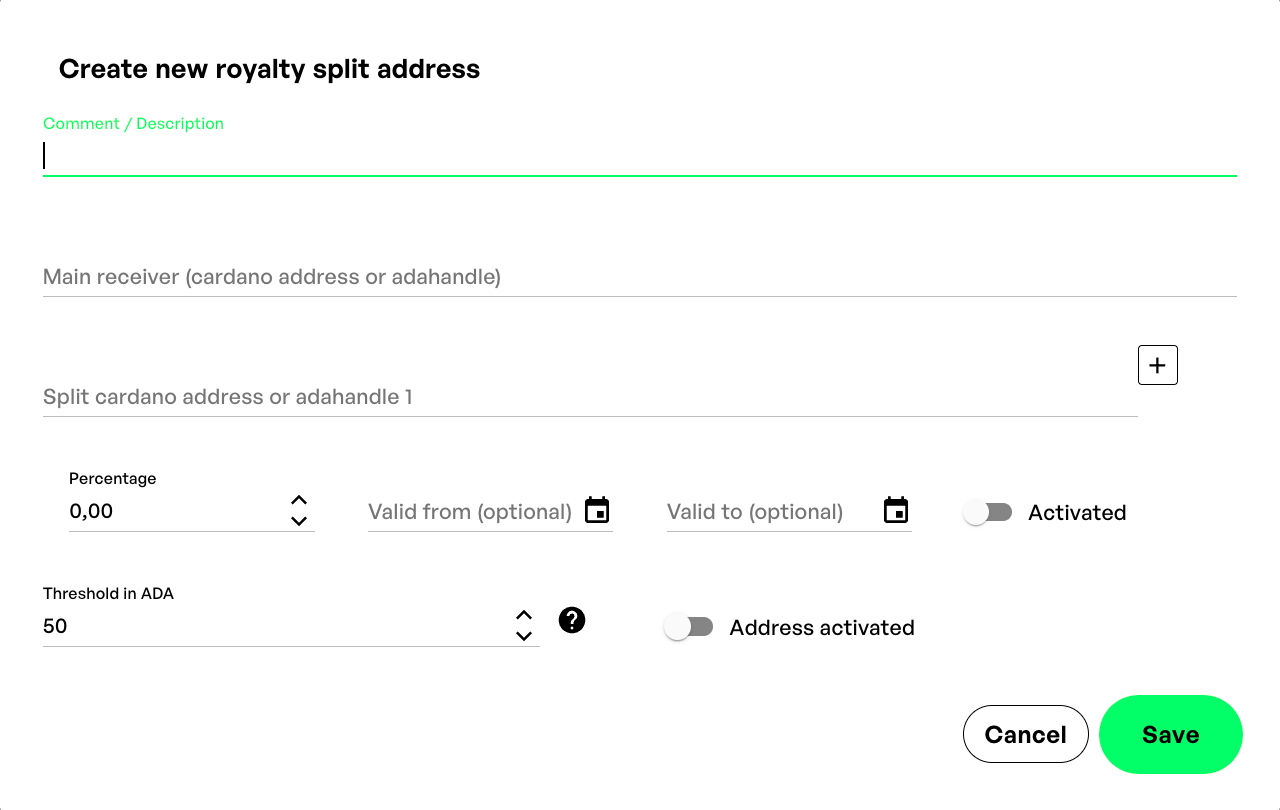 新しいタブが開き、新しい分割アドレスに関するすべての詳細を入力することができます。ここで入力する値、特に割合とアドレスまたはadahandlesを再確認してください。