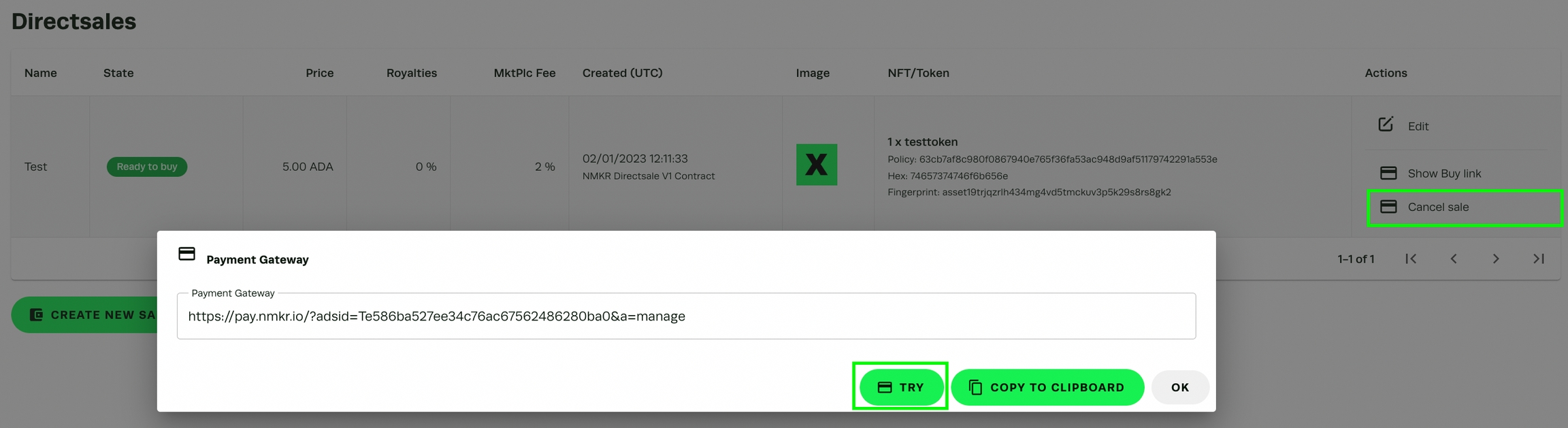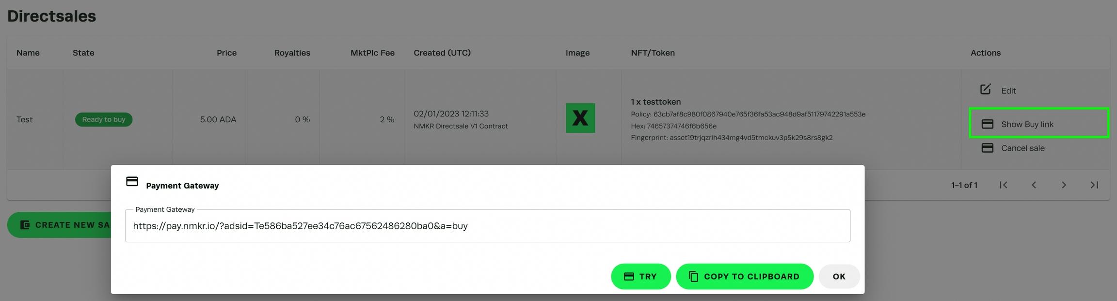 NMKR Studioの直接販売ツールを使用すると、NMKR Payを通じてNFTまたはすでにミントされた複数のFTを販売することができます。このツールを使用すると、NMKR Payに選択したトークンを出品し、ウォレットで署名した簡単な出品取引で、支払額と販売するNFTを表示する購入リンクを持つことができます。