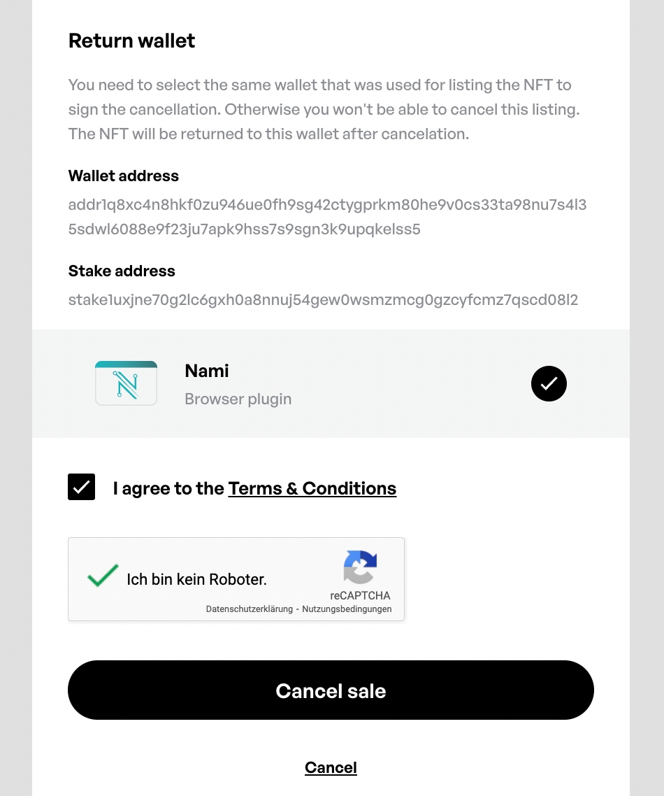 CAPTCHAを解いて規約に同意し、「販売をキャンセル」をクリックすると、ウォレットが開き、そこで取引に署名することができます。