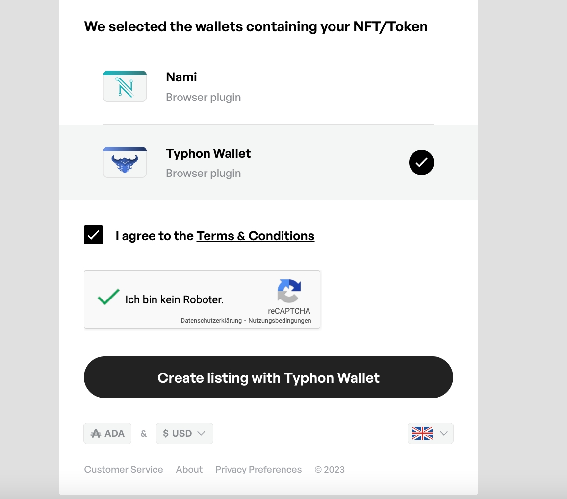 利用規約に同意し、CAPTCHAを解いて「ウォレットに出品を作成」をクリックします。これにより、選択したウォレットで出品取引が開始されます。この取引に署名すると、あなたのトークンが上場されます。