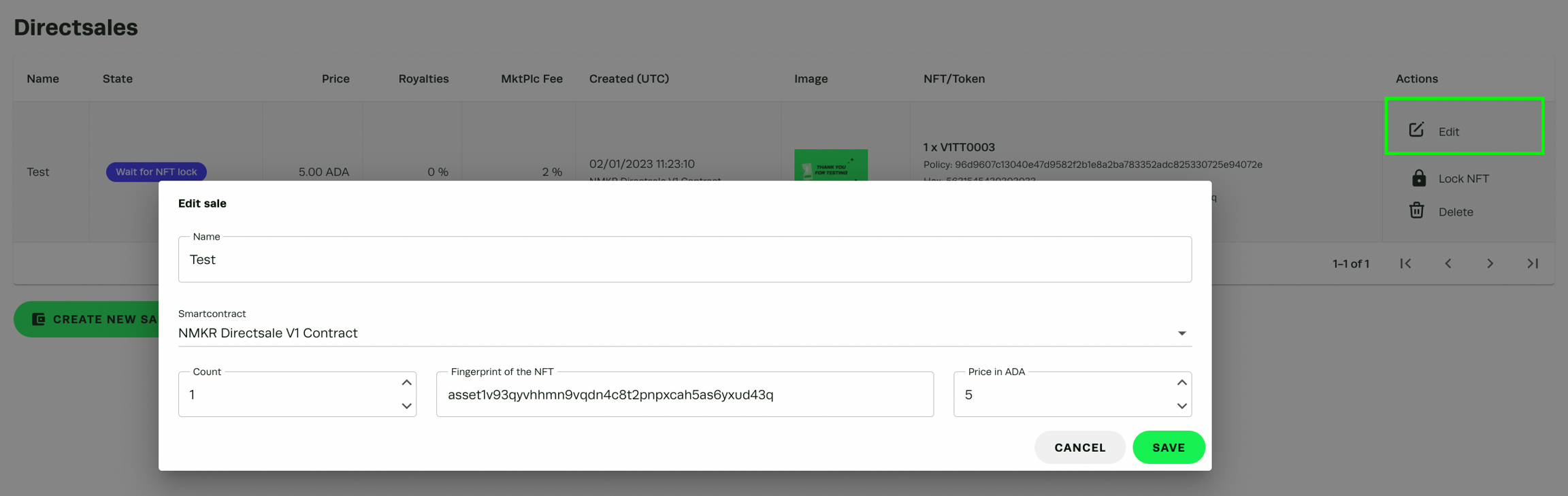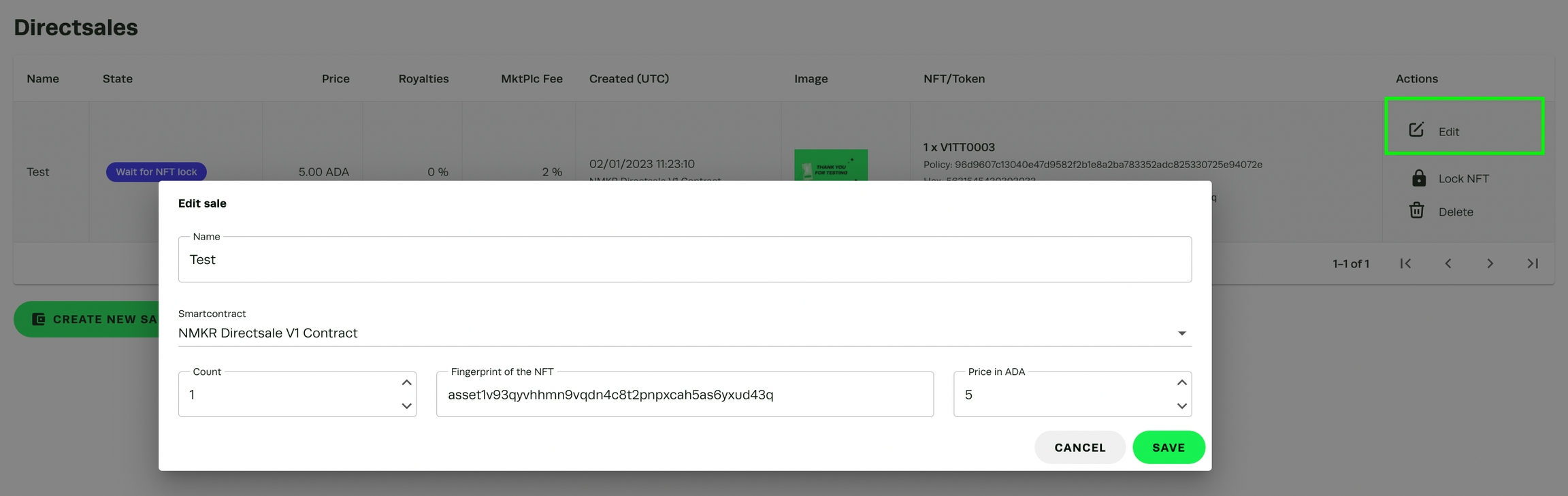 「編集」をクリックすると、この販売の名前を変更することができます。しかし、価格、フィンガープリント、カウントを変更したい場合は、新しい直接販売を作成する必要があります。