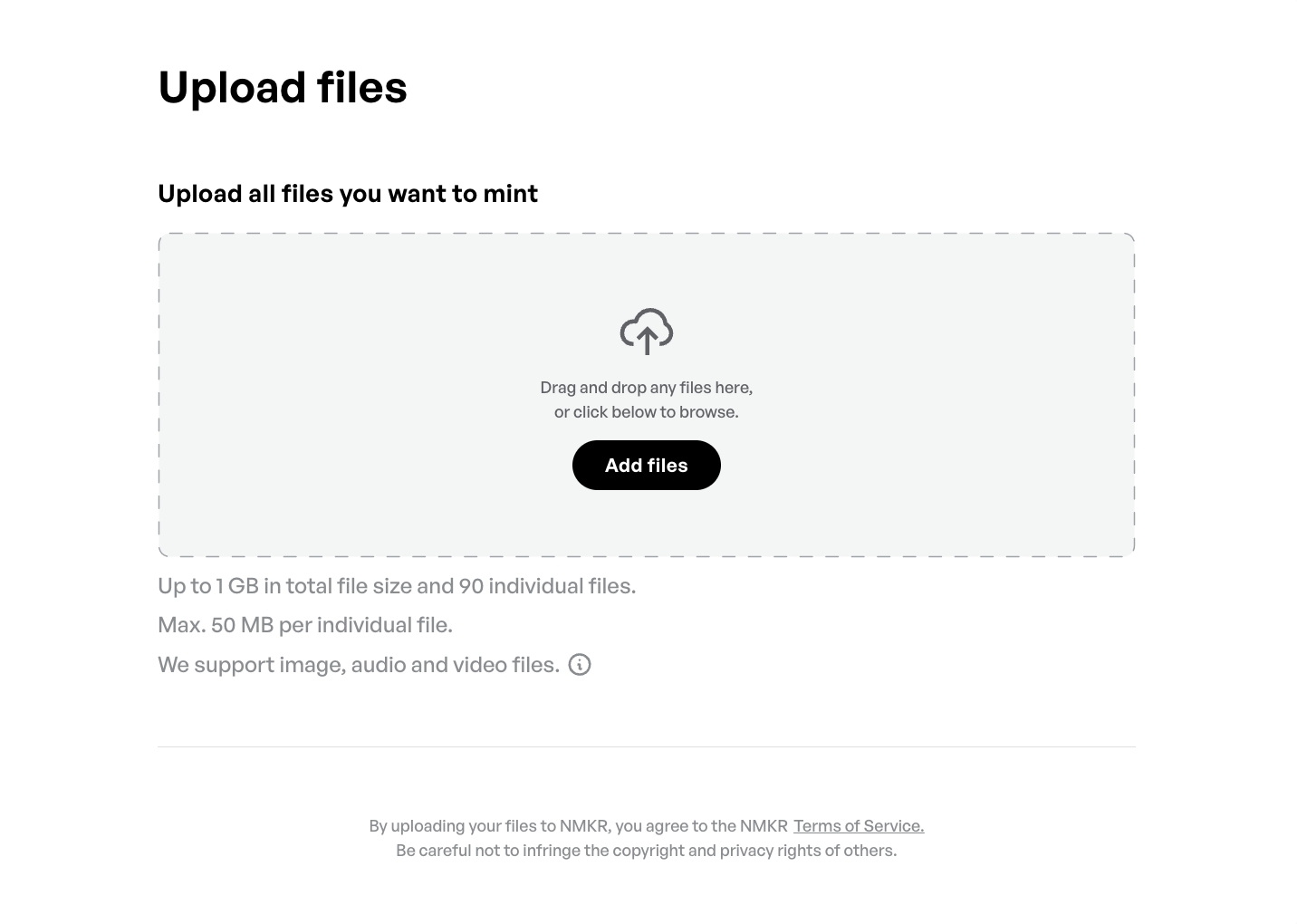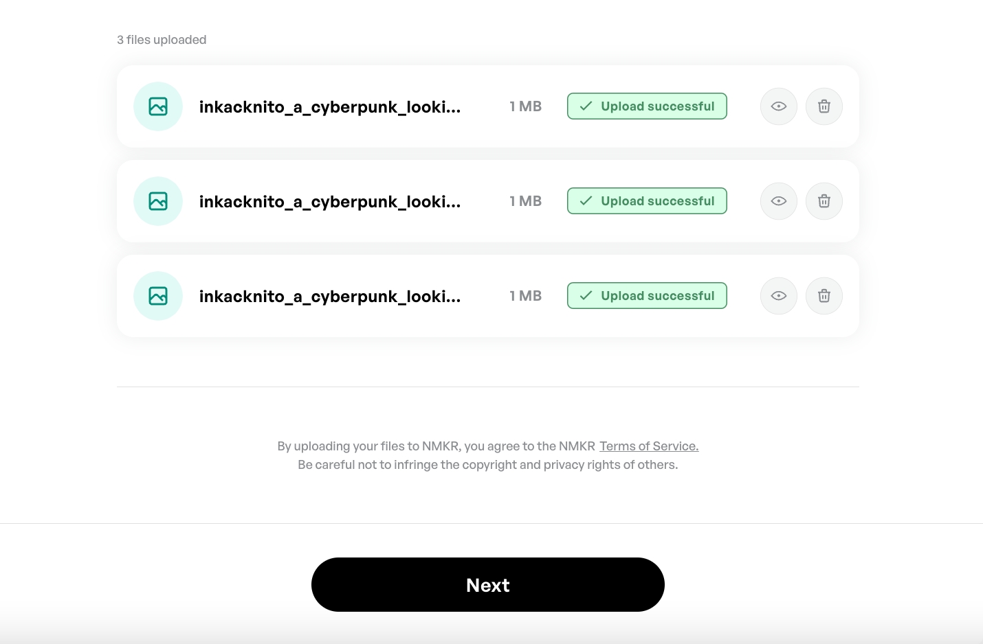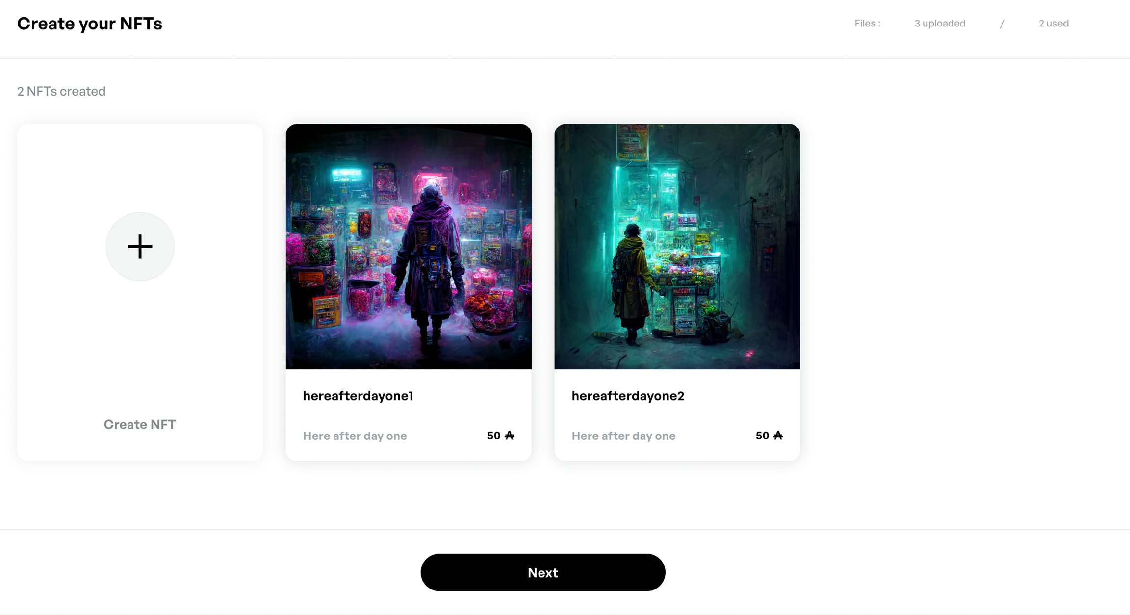 後でシングルNFTを作成するために使用するすべてのファイルをアップロードします。これは、後で各NFT用に最大6つのファイルを選択するために作成するカタログのようなものです。