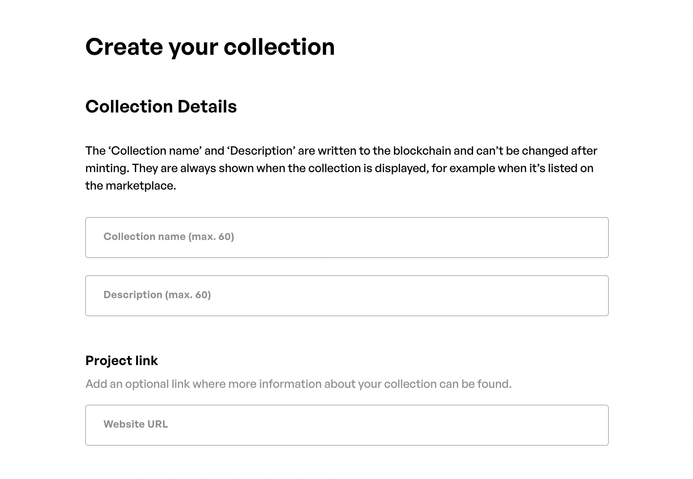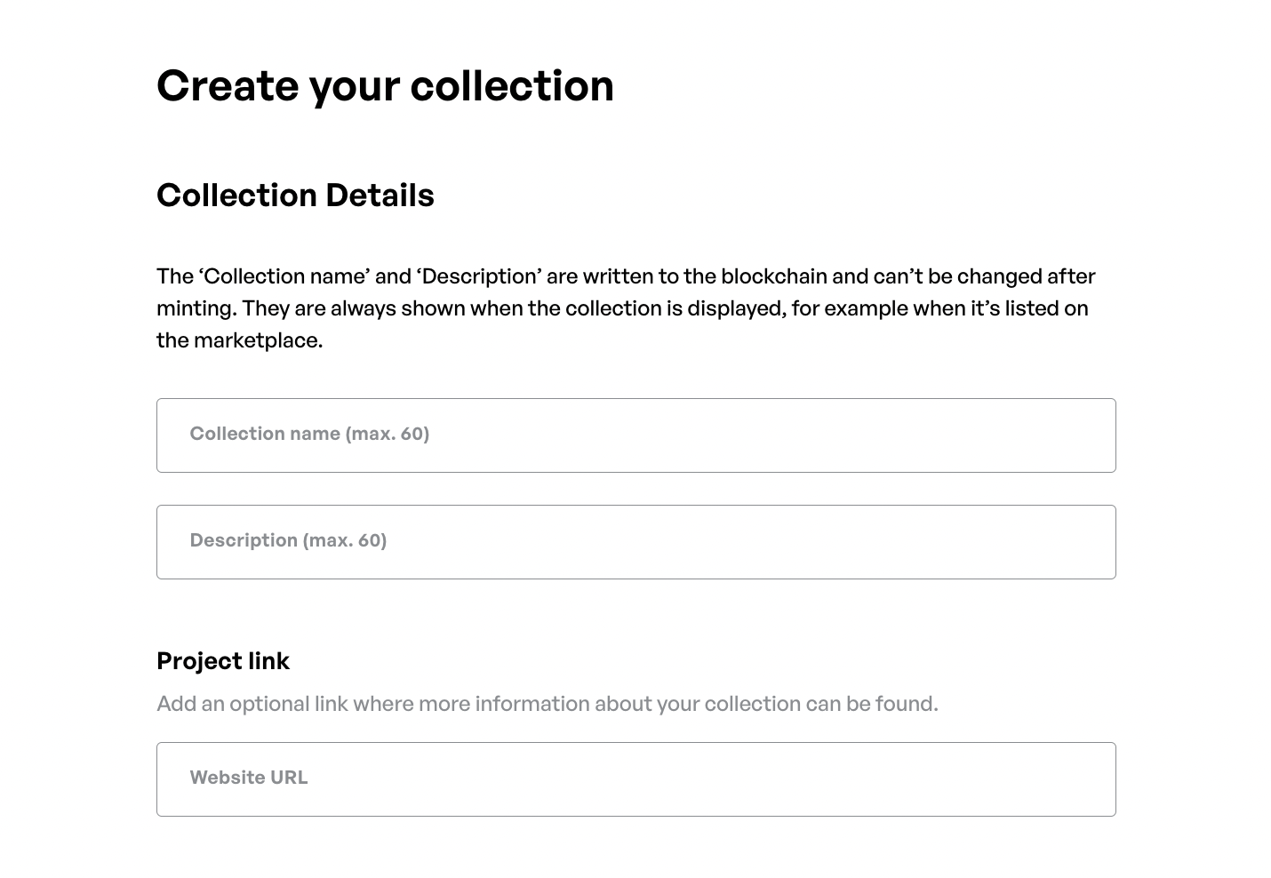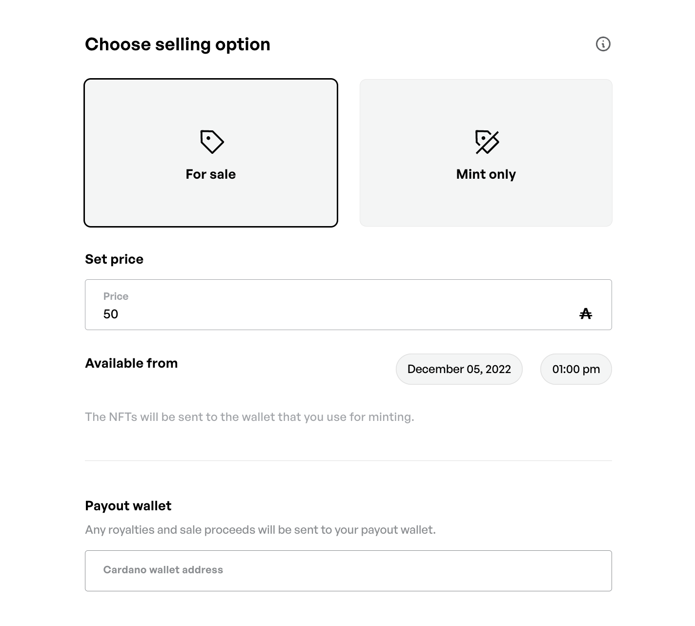 「For sale」を選択すると、コレクション内のトークンのミント価格と、売上を受け取りたいペイアウトウォレットも指定する必要があります。