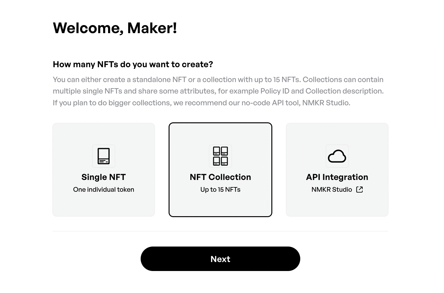 https://mint.nmkr.io、「NFT Collection」を選択し、「Next」をクリックします。