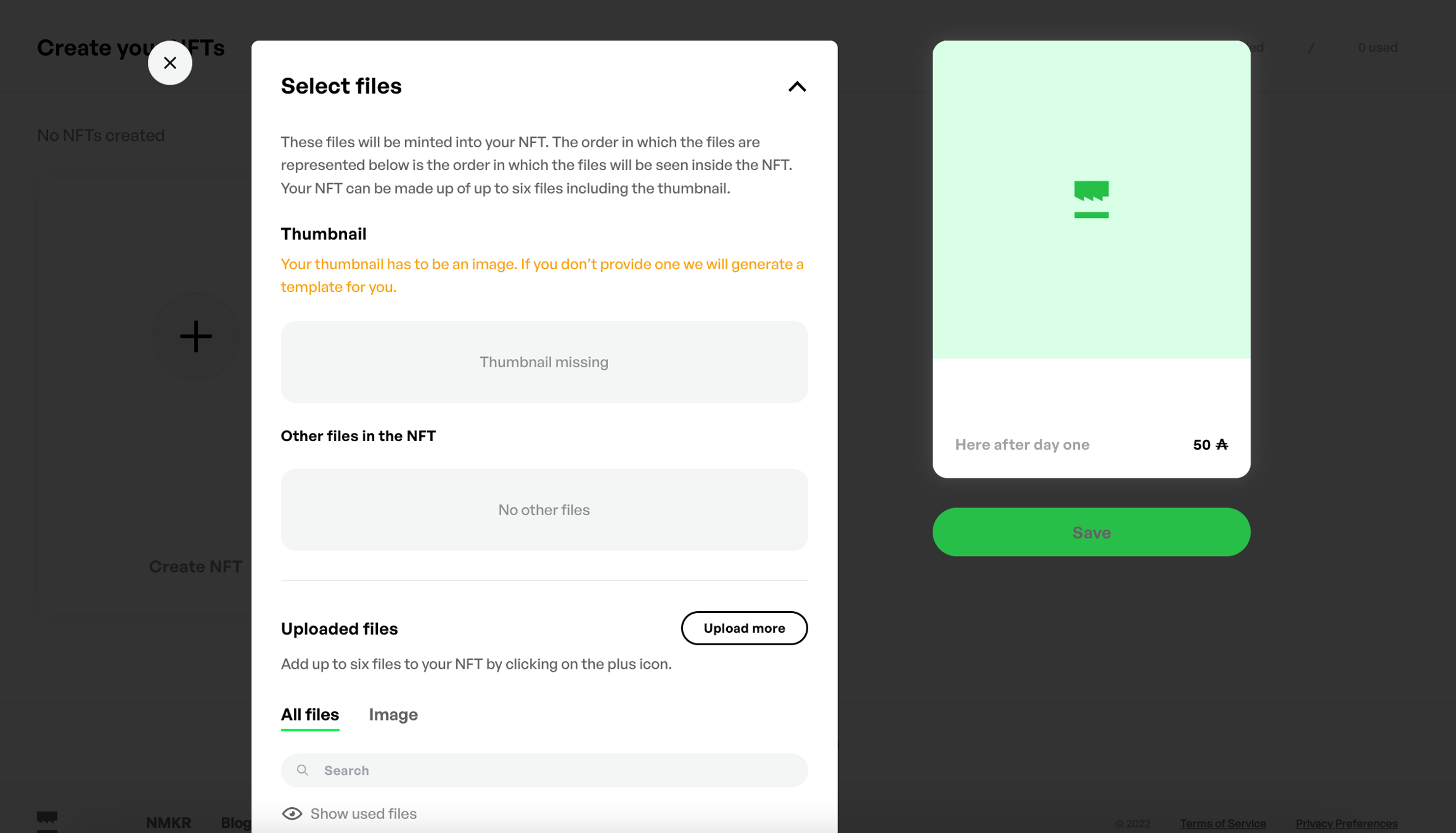 下にスクロールし、NFTに「+」をクリックして最大6つのファイルを追加します。