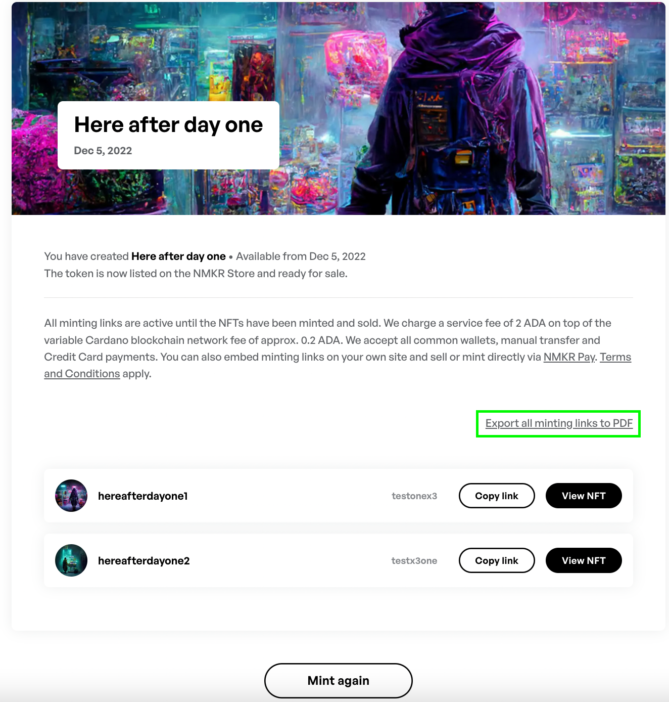 次の画面では、ミントリンクを個別にコピーしたり、NMKRストアで表示したりすることができます。「Export all minting links to PDF(すべてのミントリンクをPDFにエクスポート)」をクリックすると、すべてのミントリンクを含むPDFがダウンロードされます。「Mint again(ミントの再作成)」をクリックすると、新しいコレクションを作成するための開始画面に戻ります。