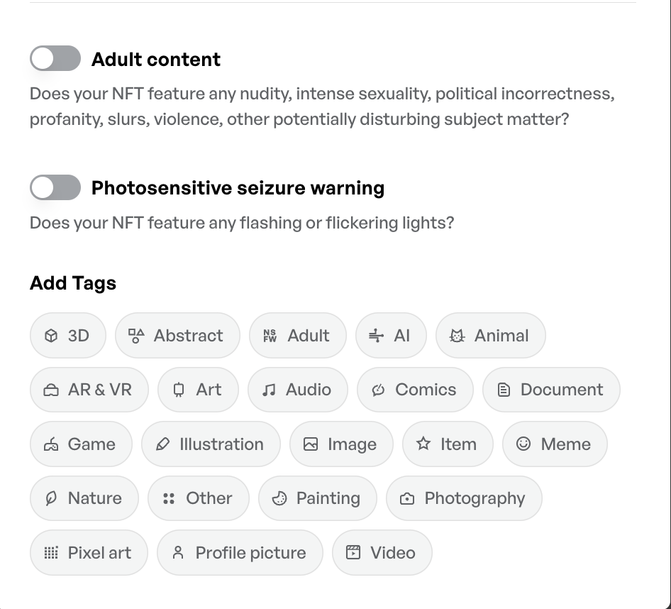 NFTにヌード(NSFW)、暴力、冒涜、中傷、不穏な題材が含まれている場合は、「Adult Content(アダルトコンテンツ)」のフラグを付けてください。