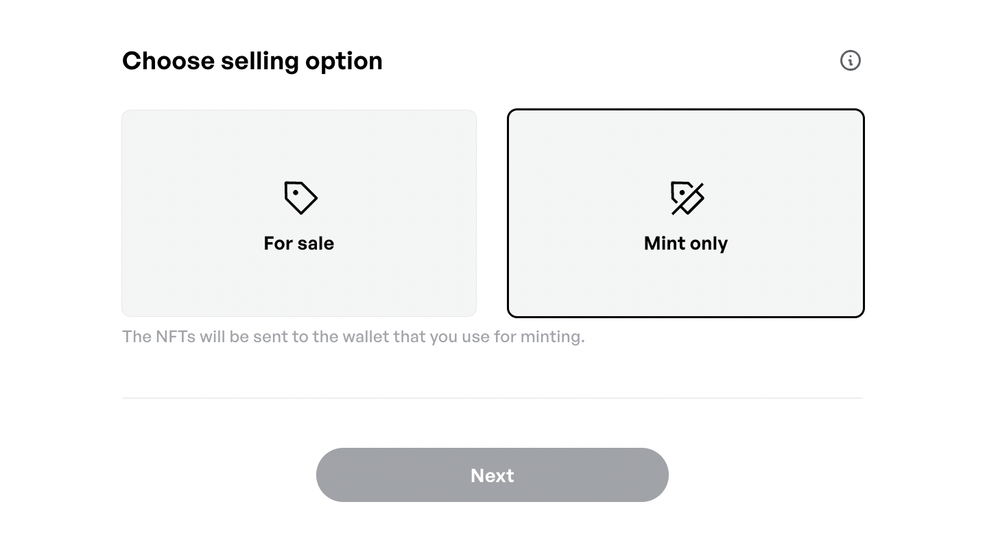 先のステップで「Mint only(ミントのみ)」を選択した場合、ここでNFTの鋳造を求められます。
