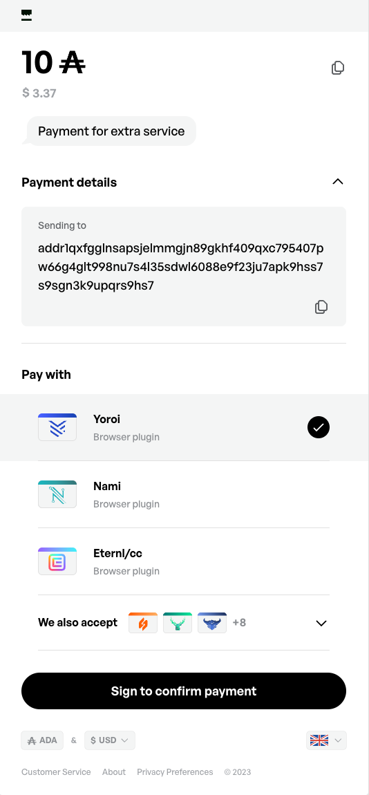 支払金額と受取人アドレスに加えて、支払リンクにカスタムメモを追加することもできます。この機能により、企業や個人は複雑な支払い統合をすることなく、便利で安全な方法でADAの支払いを受け入れることができます。