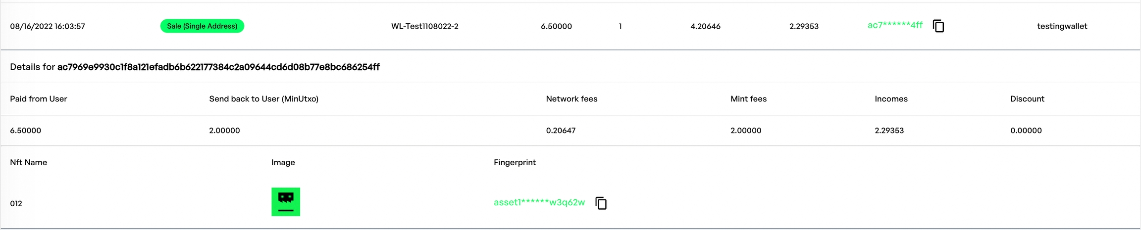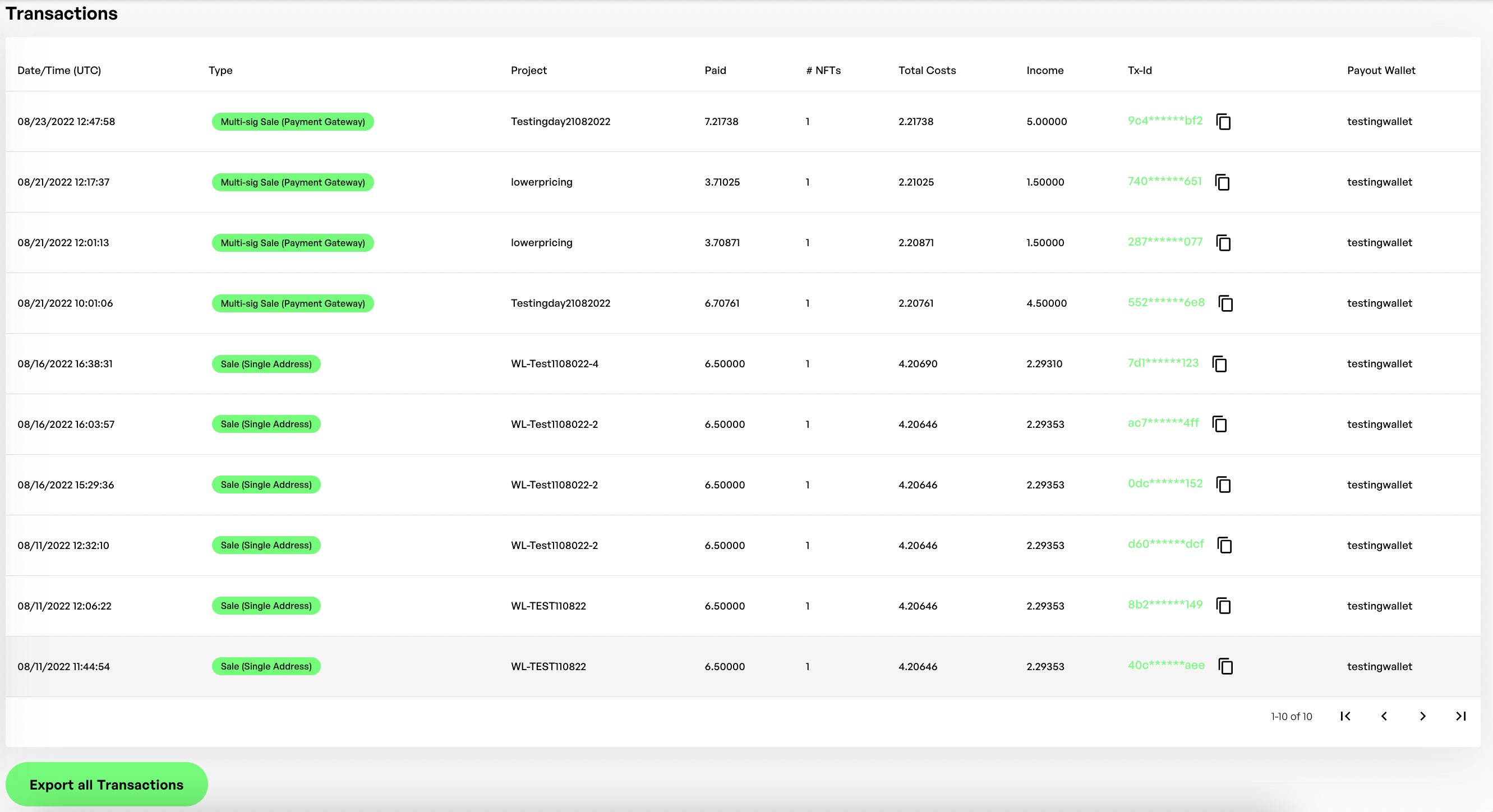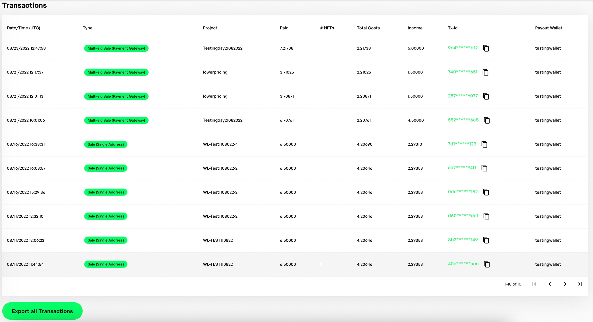 The transaction overview displays all transaction activities associated with your user account, including all project transactions, manual mints or airdrops, and royalty token minting.