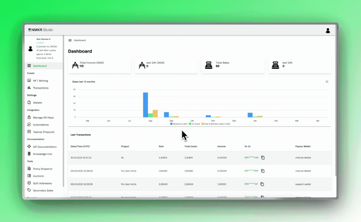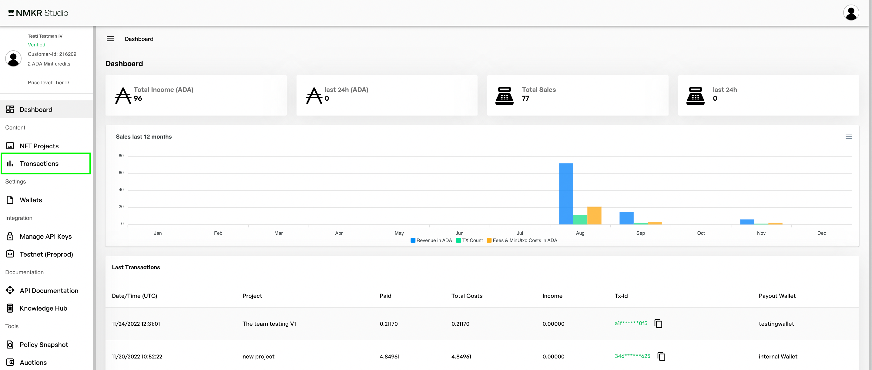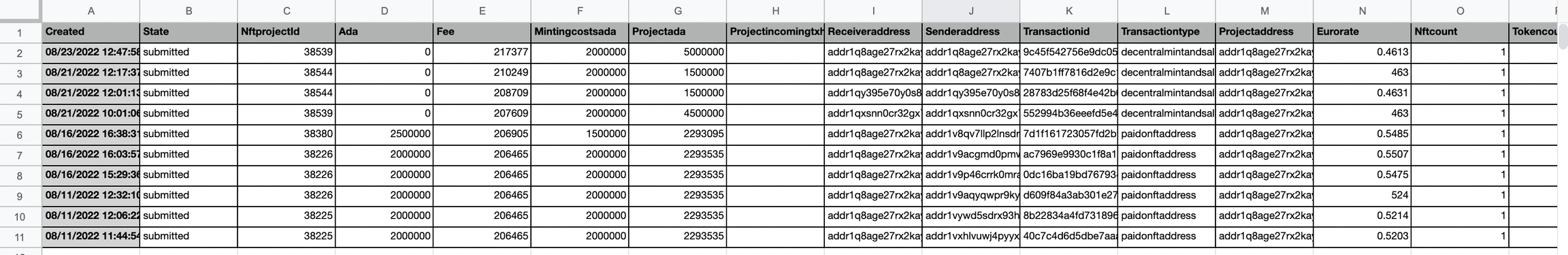 The transaction overview displays all transaction activities associated with your user account, including all project transactions, manual mints or airdrops, and royalty token minting.