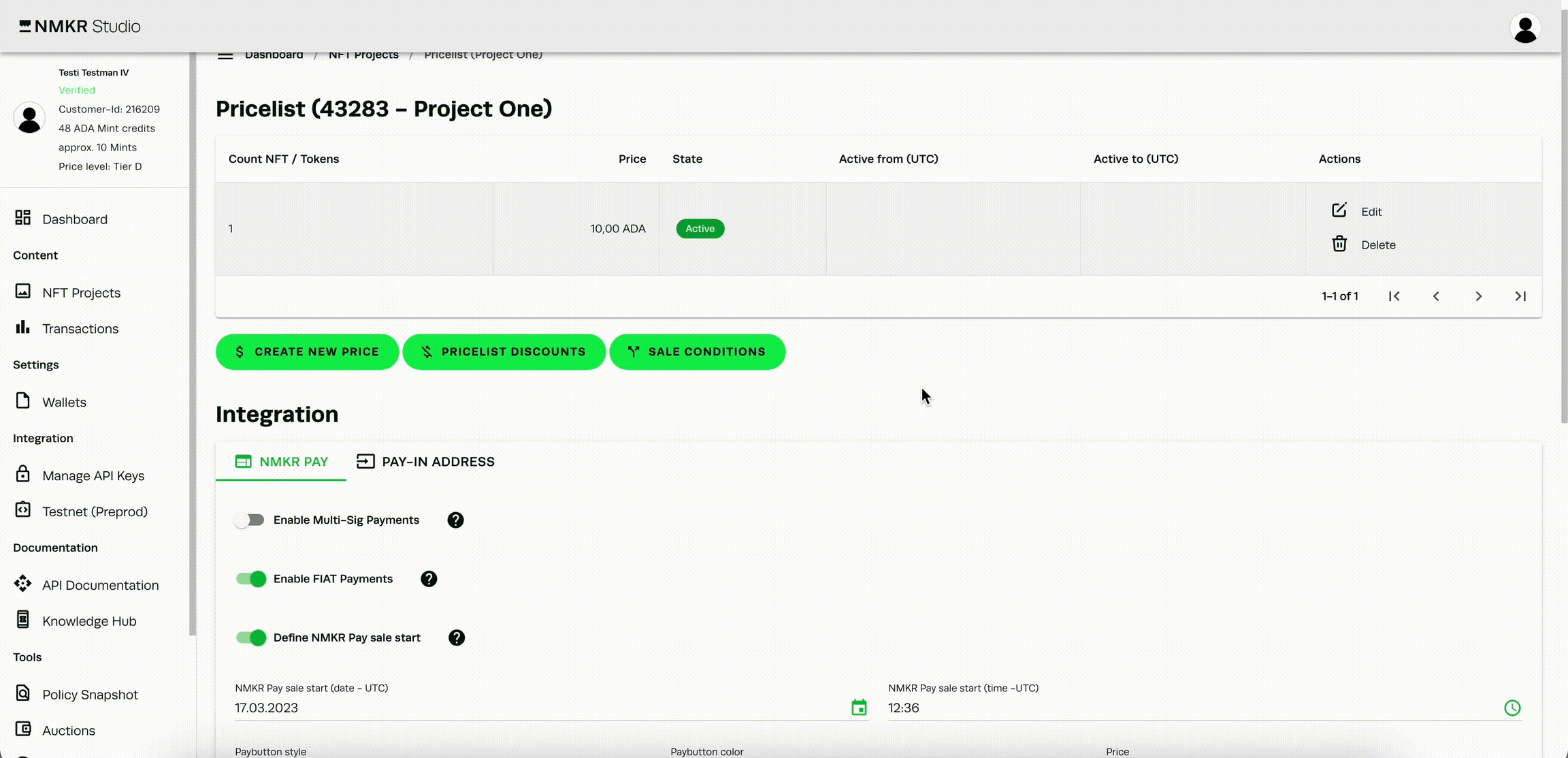 To enable the sales on demand, navigate to the price list of your project and activate the prices by clicking the edit button of each price/amount pair.