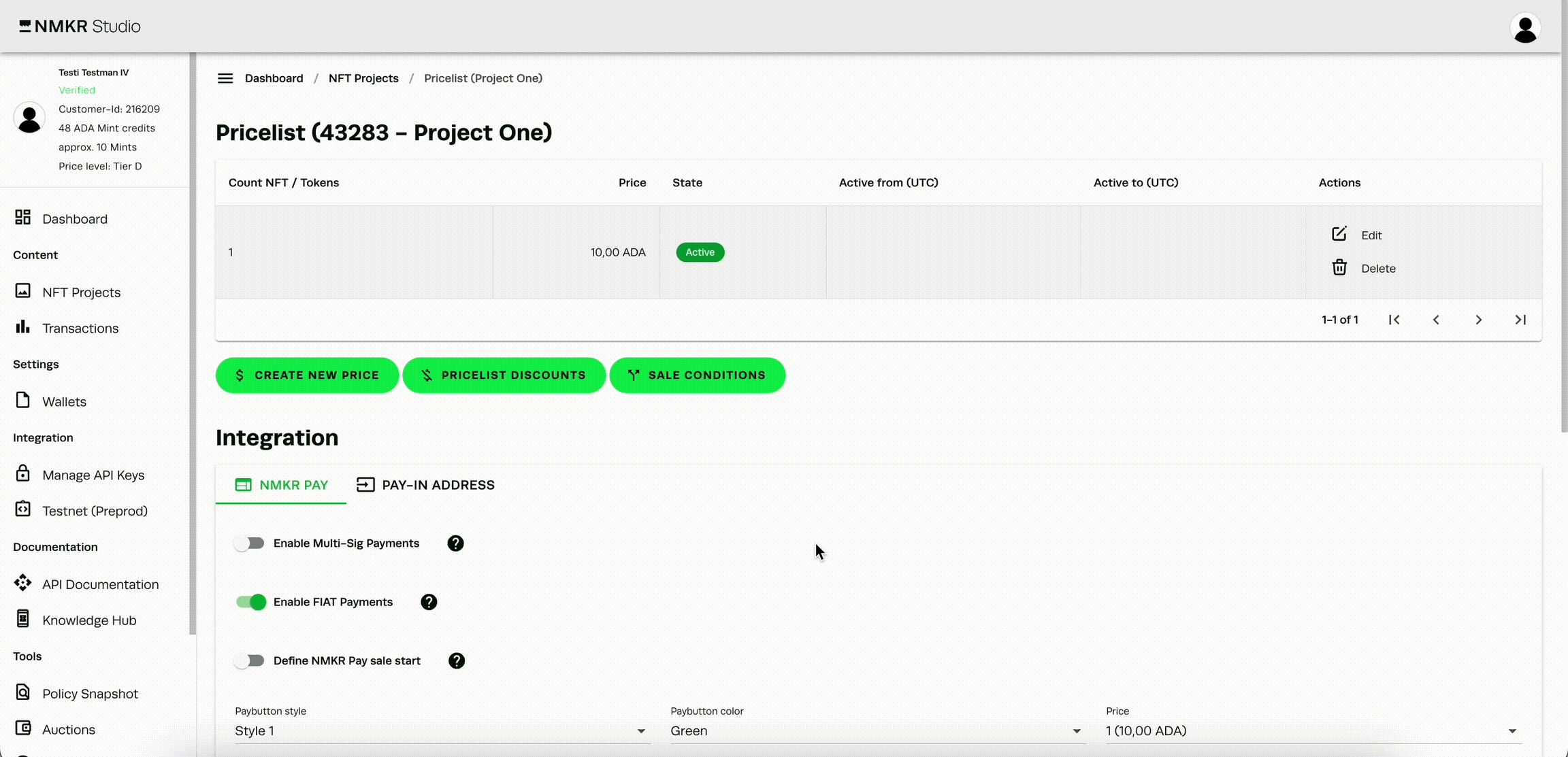 NMKR Studio makes it possible to sell your tokens on demand via NMKR Pay, which is a payment gateway that allows your customer to connect its wallet and sign the transaction, or via a static Pay-in address that autonomously mints and distributes tokens once it receives funds in the correct amount.