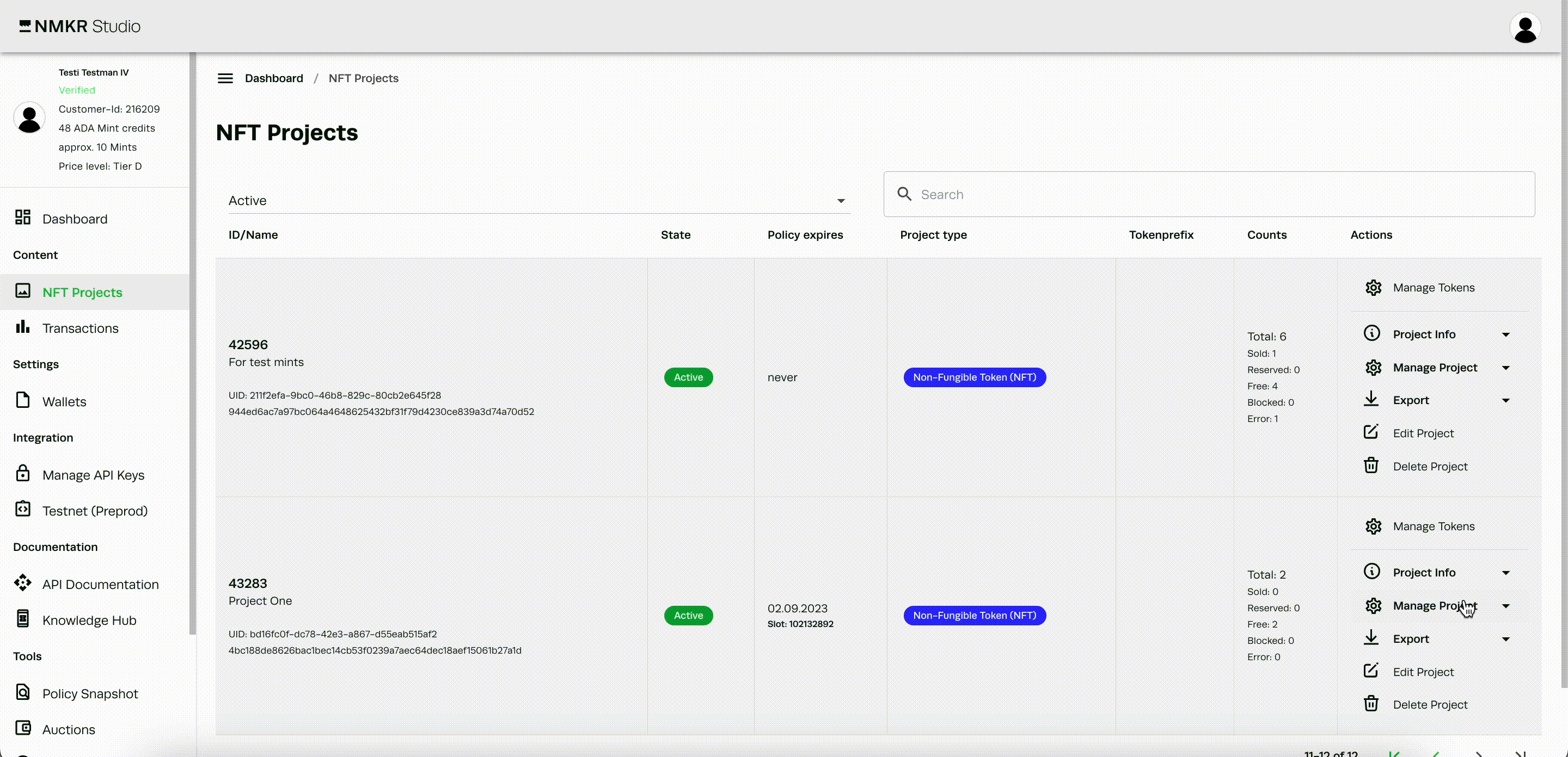 Navigate to the [price list tab of your project](https://docs.nmkr.io/nmkr-studio/set-up-sales/manage-prices-pricelist) by clicking "set NFT prices" under "Manage project" on the right side of your project.