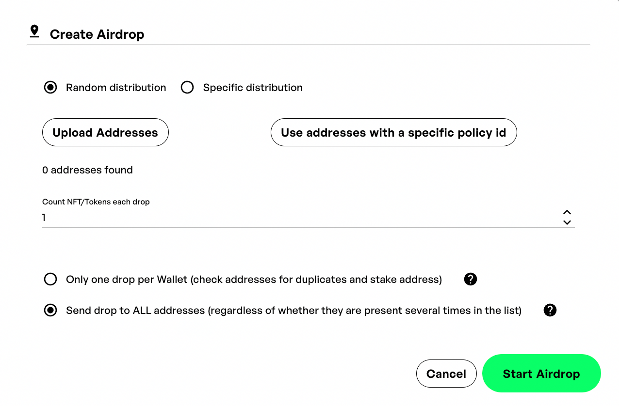 With the [**random distribution**](https://docs.nmkr.io/nmkr-studio/minting/airdropper/airdrop-with-random-distribution) you can either airdrop to [holders of a specific policy ID](https://docs.nmkr.io/nmkr-studio/minting/airdropper#airdrop-to-holders-of-a-specific-policy-id) or to an [uploaded address list](https://docs.nmkr.io/nmkr-studio/minting/airdropper#airdrop-with-address-list).\