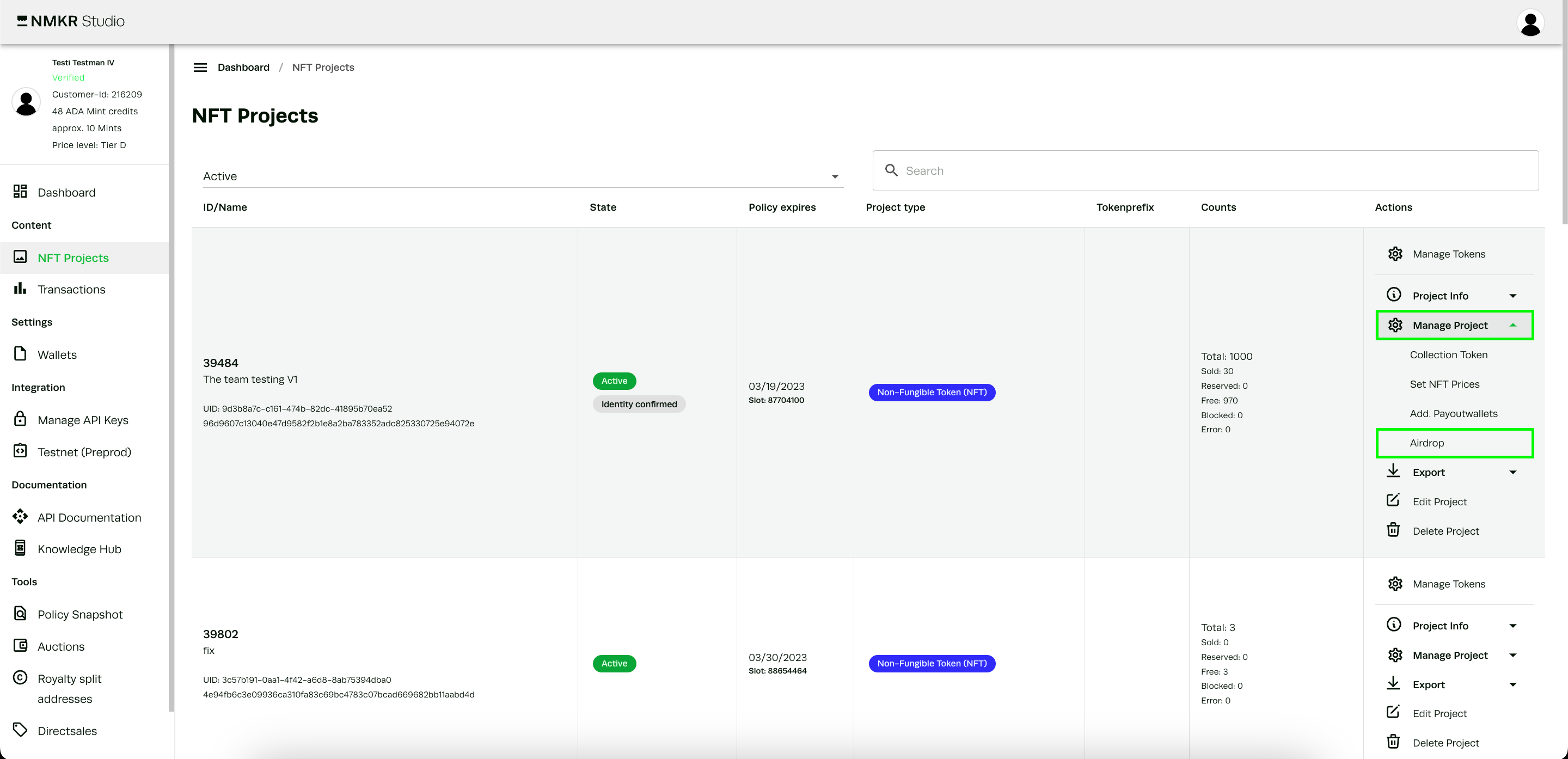 To further reduce the cost of airdropping, please set the [Sendback in your project settings to MinUtxo](https://docs.nmkr.io/nmkr-studio/project/edit#sendback-to-customer). This will calculate the sendback for each transaction depending on the metadata size and token amount. A token airdrop with 3 NFTs in one transaction to one wallet costs with these settings and the standard metadata about 1.4 ADA.