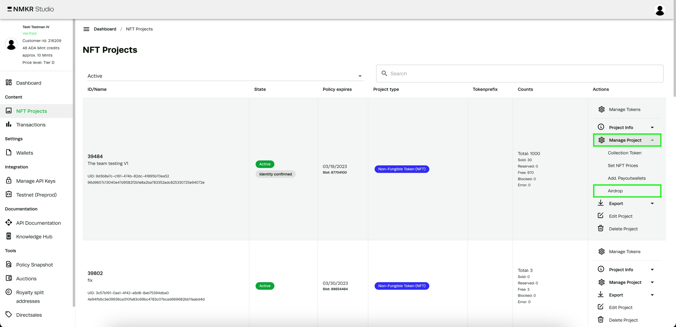 As the airdropper will always use the tokens of a specific project, the button for the airdropper can be found in the actions bar of each project.