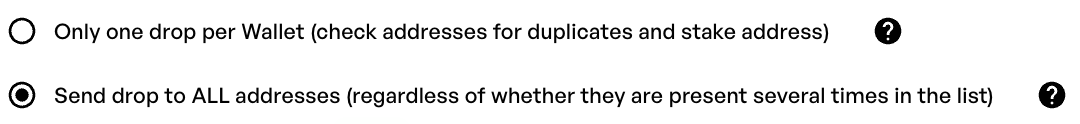 Addresses with multiple eligible tokens of a policy will appear on the list multiple times if the [cumulate option was disabled in the policy snapshot](https://docs.nmkr.io/nmkr-studio/tools/policy-snapshot#cumulate-stake-addresses-of-the-policy-snapshot), which is why you should select "**Send drop to ALL Addresses"** if you want to send the airdrop depending on the amount of eligible tokens that the wallet holds.&#x20;