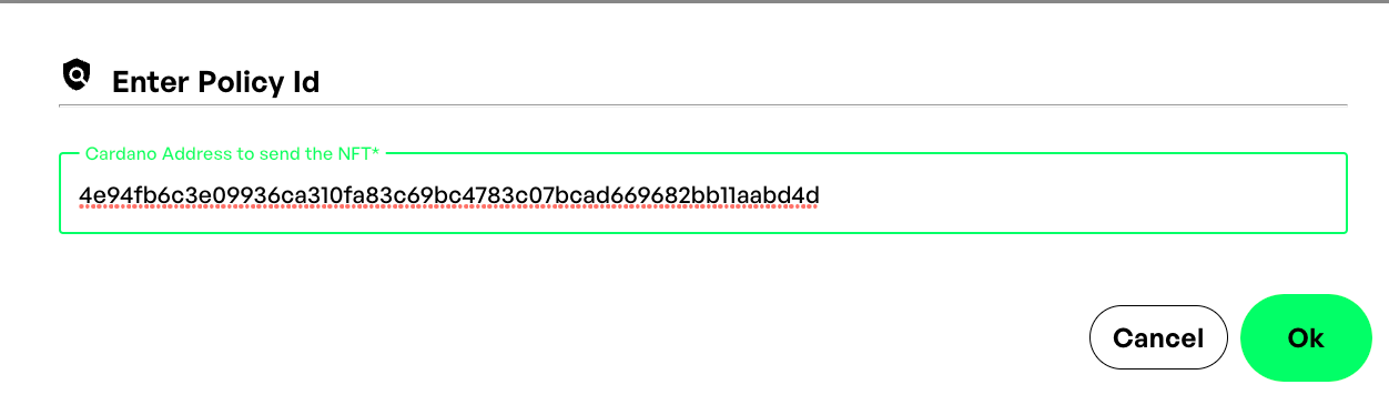 <figure><img src="https://content.gitbook.com/content/bv1NlCoA0UqqILhTF1t0/blobs/9RlL3N8xX6TGpjYlGZ78/Screenshot%202022-11-08%20at%2013.42.27.png" alt=""><figcaption><p>Enter Policy ID and confirm</p></figcaption></figure>