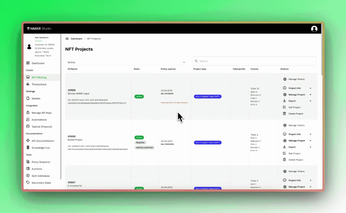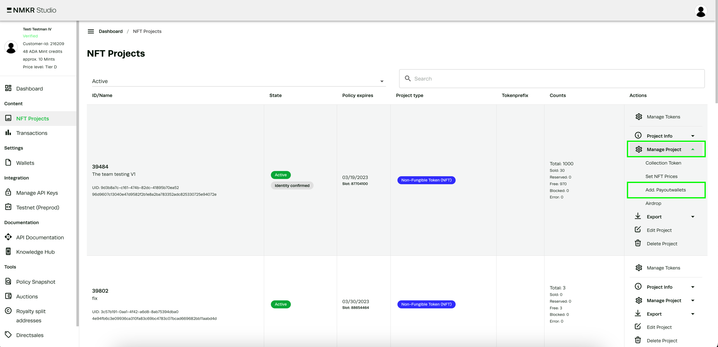 Additional payout wallets are defined for every project separately. Therefore you find the button "Additional Payout Wallets" in the actions bar on the right of every project in your NFT projects tab.